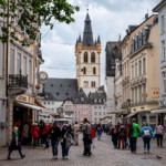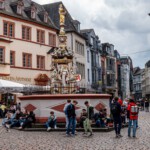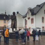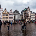Anschließend ging es weiter nach Trier, wo zuerst Freizeit angesagt war, die jeder im Zentrum nach Lust und Laune verbringen konnte, die die meisten für einen eigenen Entdeckungsgang oder für eine Mahlzeit in den zahlreichen Imbissbuden oder Gaststätten entlang der Haupteinkaufsstraße nutzten, bevor die offiziellen Führungen – aufgeteilt auf zwei Gruppen (wie auch bei allen weiteren Führungen in den nächsten Tagen) – begannen. Schade nur, dass inzwischen der Regen begonnen hatte.