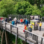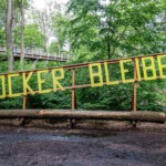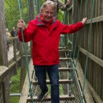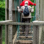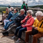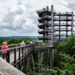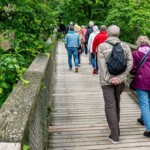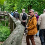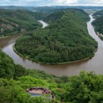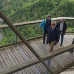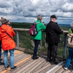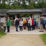 Zirka 40 Minuten später oder 50 Kilometer von der grauschwarzen Industriekulisse entfernt durfte sich die Gruppe beim Kurort Orscholz/Mettlach in der grünen Natur erholen. Entlang eines 1.250 Meter langen Baumwipfelpfads ging es zum 42 Meter hohen Aussichtsturm, wobei man schon beim Gang über die Serpentinen hoch zur oberen Plattform einen tollen Ausblick über die tief unter einem liegenden Saarschleife und die weithin sichtbare waldreiche Landschaft erhielt. Gut, dass man vor ein paar Jahren den nicht ganz unumstrittenen Aussichtspunkt errichtet hatte, da man vom alten, tiefer liegenden Aussichtspunkt Cloef eben nicht diesen weiten Blick auf die Landschaft erhält, wie einige auch dorthin gelaufene Teilnehmer anschließend berichteten.