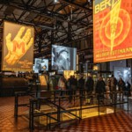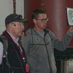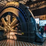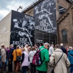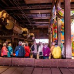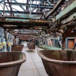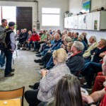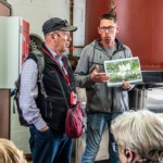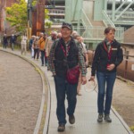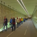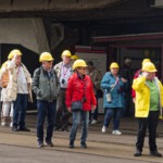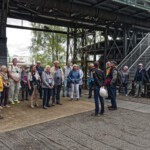 Nach der Begrüßung durch unsere beiden Guides startete die Führung in der ehemaligen Gebläsehalle, in der mehrere riesige Gebläsemaschinen den notwendigen „Wind“ (Druckluft) für die Verbrennung in den Hochöfen erzeugten, wobei diese wiederum von dem in den Hochöfen erzeugten und gereinigten Gichtgas angetrieben wurden. Unsere Blicke wurden aber nicht nur von den großen Schwungrädern der Gebläsemaschinen angezogen, sondern auch von den vielen Filmen, die im Rahmen der Ausstellung „Der deutsche Film von 1895 bis heute“ auf den diversen in der Halle aufgespannten Leinwänden liefen. Weiter gings an der Sinteranlage vorbei, in der die Reststoffe des Verhüttungsprozesses durch starkes Erhitzen zu etwa faustgroßem Material zusammengebacken und so wiederverwendbar gemacht wurden, nun zu den 6 Hochöfen. Hierbei passierten wir aber erst noch die Gerüstanlage der Hängebahnwagen, die über zwei Schrägaufzüge alle sechs Hochöfen auf der Gichtbühne mit Erz und Koks versorgten. Nun galt es, die Gichtbühne über viele Stufen zu erklimmen (die nicht mehr so fitten Teilnehmer durften den Aufzug benutzen), um auf 27 m Höhe nicht nur die Spitzen der Hochöfen vor sich zu haben, sondern auch einen interessanten Blick auf das Gelände der Hütte mit der damaligen Kokerei und auf die Umgebung mit den mit den hochaufragenden Spitzkegelhalde im Hintergrund der ehemaligen Kohlegruben wie auch auf die noch existierenden Stahlwerke der Saarstahl AG. Interessante Fotomotive boten dabei das Gewirr von Rohren und Kaminen und vor allem die dreieckigen Hosenrohre. Wieder zurück auf dem Boden angelangt gings durch die Möllerhalle, in der die Rohstoffe für den „Möller“ – die Hochofenmischung aus Eisenerz, Sinter, Schrott und Kalk – gelagert und dann in die Hängebahnwagen geladen wurden. Bevor es zurück zum Ausgang ging, bestand für die Interessierten noch die Möglichkeit, in einem Teil der Sinterhalle durch eine weitere Ausstellung bzw. an einen Erinnerungsort zu gehen, der mittels unzähligen aufeinander gestapelten rostigen Archivkisten an die vielen Zwangsarbeiter und Kriegsgefangene erinnern sollen, die hier unter Zwang die Arbeit verrichten mussten.