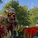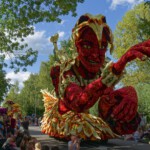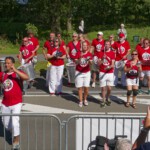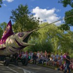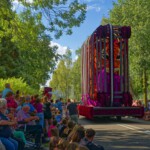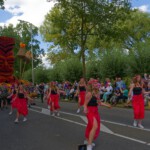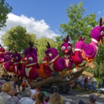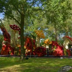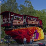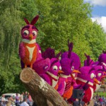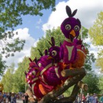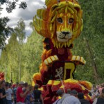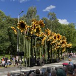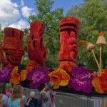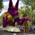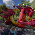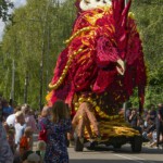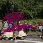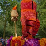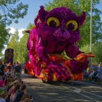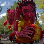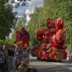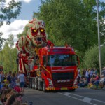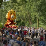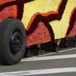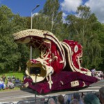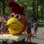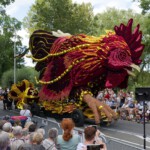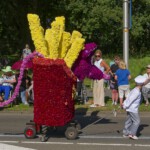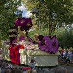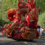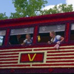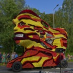 Wow! Damit hatte nun wirklich keiner der mitgefahrenen Jonges und Mädchers gerechnet – selbst die nicht, die sich vorher schon einige Bilder vom letztjährigen Blumencorso im Internet angeschaut hatten. Angefangen mit der Kindergruppe der Vereine, die auch schon mit kleinen blumengeschmückten Wägelchen an unseren Tribünenplätzen vorbeizogen, folgten dann 18 über und über mit Blumen oder auch mit Moos oder Gräsern phantastisch geschmückte Blumenwagen, zwischen denen mehrere Musikgruppen auch für nette Unterhaltung sorgten. Immer wieder hörte man die Worte „Wahnsinn“ oder sah das Staunen in den Gesichtern aller auf der Tribüne sitzenden Zuschauer, wenn einer der riesigen, mit bis zu 300.000 (teilweise auch gefärbten) Dahlien und bis zu 21 Meter langen und/oder auch bis zu acht Meter hohen Figurenwagen an uns vorbeizogen, bei denen sich auch noch zusätzlich bei den Figuren vieles bewegte. Toll, wenn man auch bedenkt, dass – bis bei der größten Figur – alle anderen Wagen nur mit Muskelkraft vorwärts bewegt wurden.