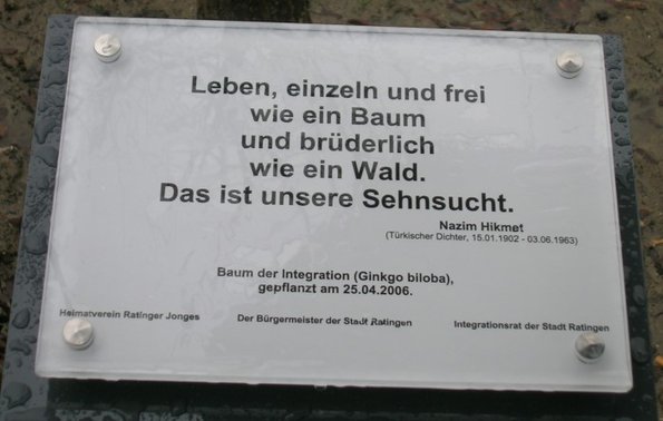 Der hierauf gravierte Sinnspruch „Leben, einzeln und frei wie ein Baum und brüderlich wie ein Wald, das ist unsere Sehnsucht“ sollte die zahlreichen Anstrengungen zur Integration ausländischer Mitbürger in unserer Stadt symbolisieren. Die Freude über dieses Ereignis währte jedoch nur kurz: Schon bald war die Gedenktafel verschwunden. Anlässlich des Dreck-Weg-Tages wurde sie zufällig im Gebüsch der Parkanlage wiedergefunden und erneut angebracht. Doch auch dies war nicht von Dauer.