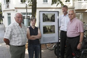 Auf den Rückseiten der Hinweisschilder findet nunmehr der historisch Interessierte Abbildungen der jeweiligen Straßenzüge aus vergangener Zeit. Nach Recherchen im Ratinger Stadtarchiv wurden mit Unterstützung der Denkmalspflegerin, Anna-Maria Voss und dem bei den Jonges zuständigen Vorstandsmitglied für Stadtbildpflege, Guido Multhaupt, Motive ausgesucht, auf denen Gebäude zu sehen sind, die bis in heutiger Zeit die Innenstadt prägen, so zum Beispiel die Suitbertusstuben, das älteste Fachwerkhaus Ratingens oder die Stadtsilhouette.