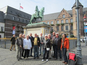Die Kunsthistorikerin Frau Dr. Sabine Tünkers begleitete die Ratinger Jonges nun schon zum sechsten Mal auf kulturhistorischen Pfaden. Jan Wellem, die Geschichte der Stadt und das Schloss Düsseldorf standen hierbei im Mittelpunkt. So erfuhren die Jonges viel Wissenswertes über die Stadt Düsseldorf, von der urkundlich ersten Nennung 1159 als „Düsseldorp“ bis hin zur Landeshauptstadt des Landes NRW mit heute knapp 600.000 Einwohnern. Natürlich brauchte eine immer größer werdende Stadt unter den verschiedensten Regenten auch ein ihr zustehendes markantes Gebäude. So entstand bereits im 14. Jahrhundert das Schloss Düsseldorf. Es erlebte eine wechselvolle Geschichte mit mehreren Zerstörungen durch Kriegseinflüsse sowie Brände. Es folgten Wiederaufbauten, wovon heute nur noch der Schlossturm existiert. In dieser wechselvollen Geschichte begleiteten viele Regenten die Stadt. Einer der bekanntesten von ihnen war Jan Wellem von 1679 bis 1716. Unter ihm erlebte Düsseldorf wirtschaftlich und kulturell seine Blütezeit. Das Reiterdenkmal von 1711 auf dem Düsseldorfer Marktplatz zeigt den bei der Bevölkerung sehr beliebten Kurfürsten und ist heute ein Wahrzeichen Düsseldorfs. Die Teilnehmer der kulturhistorischen Spurensuche waren rundherum von dem Vortrag und Besichtigungen begeistert.