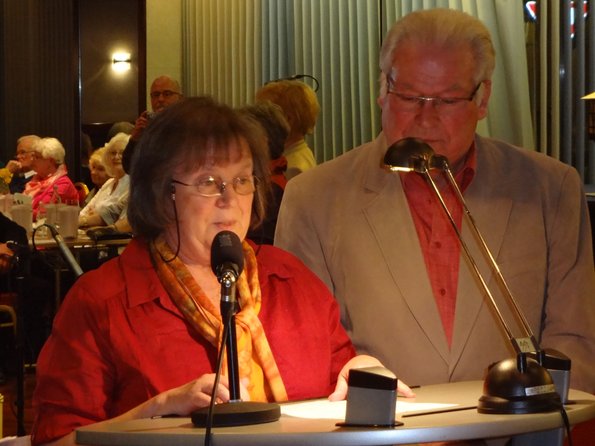 Ein rappelvoller Spiegelsaal präsentierte sich den Mundartfreunden. Aber nicht nur Jonges-Mitglieder waren unter den Zuhörern, sondern auch viele Gäste, unter anderem die 1. Vorsitzende der Ratinger We-iter e.V. Hildegard Pollheim. Das hatte einen ganz besonderen Grund. Friedel Bonn, der Leiter des Mundartkreises wurde als 5. Preisträger mit der Ehrennadel des Vereins ausgezeichnet. In der Laudatio von Hildegard Pollheim hieß es: „Du häss vüll dofür jedonn, dat de Ratinger Mundart nit ungerjeht und dofür danke mer dech“. Es soll eine Anerkennung für Deinen nimmermüden Einsatz für die Ratinger Mundart sein. Einen besseren Rahmen hätten die We-iter nicht wählen können.