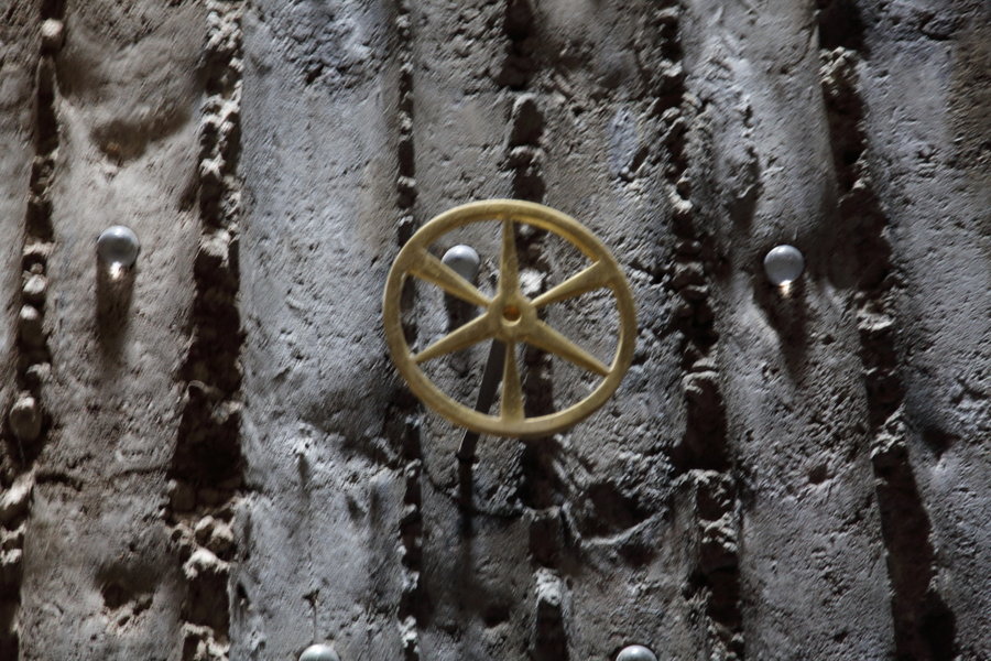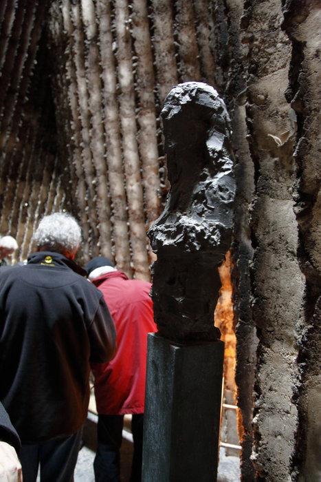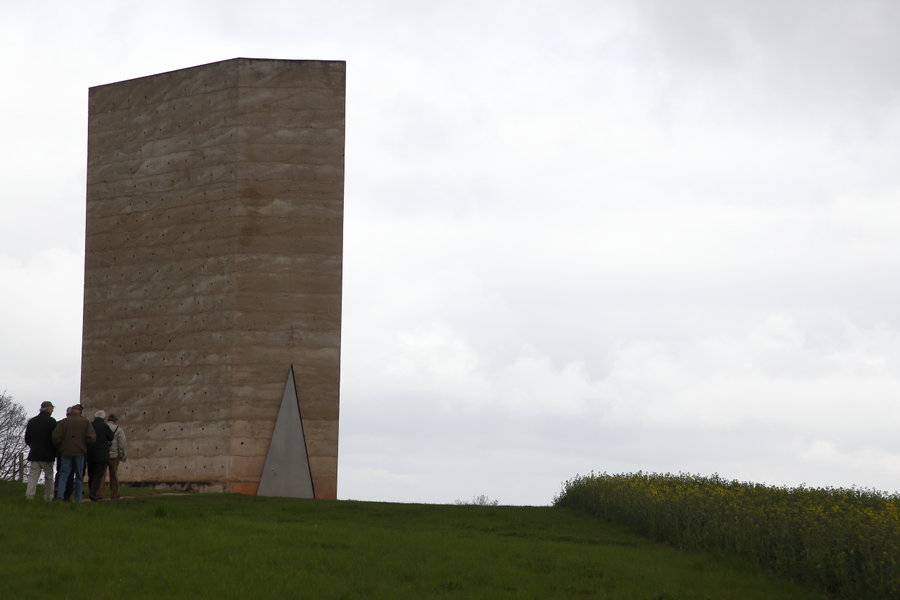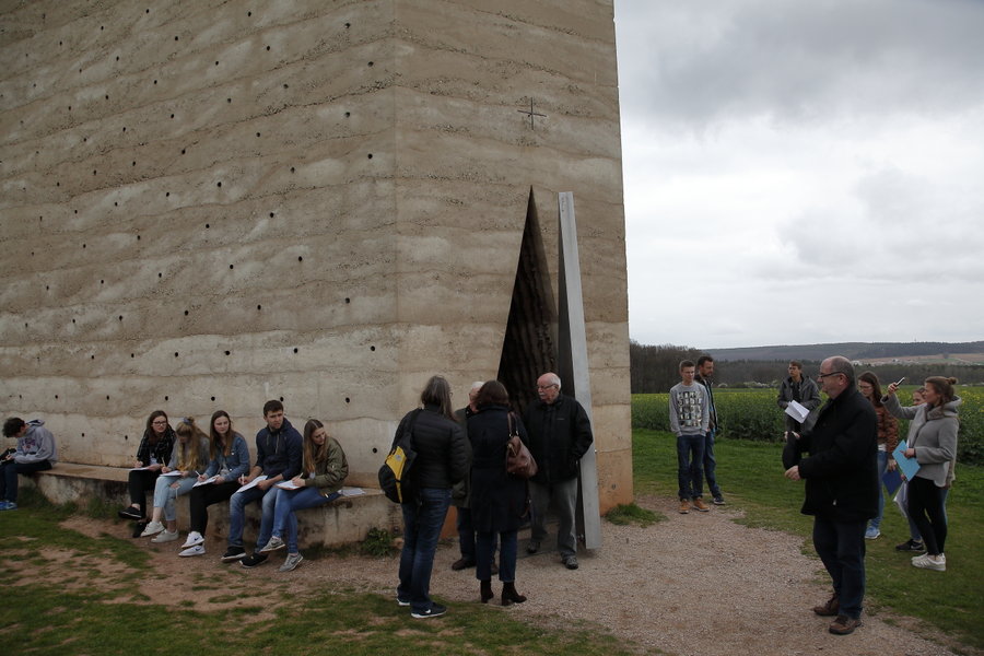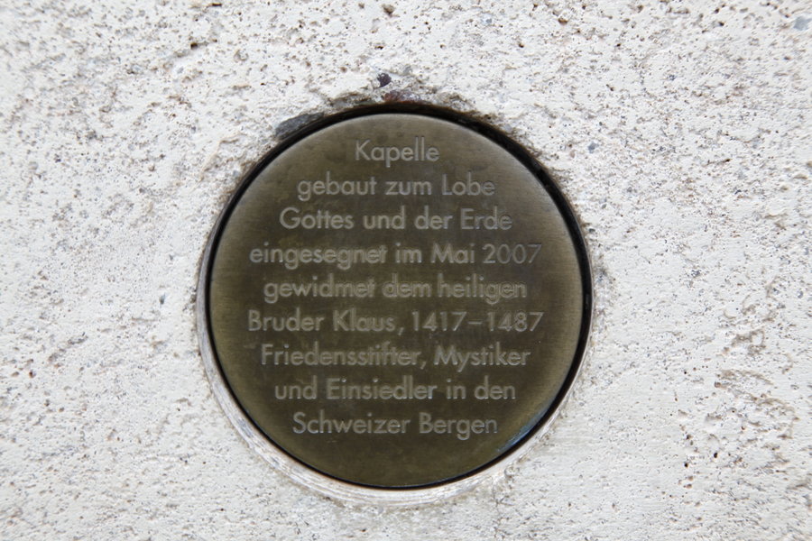 Das Landwirts-Ehepaar Scheidtweiler hatte die Kapelle gestiftet und von dem Schweizer Architekten Peter Zumthor entwerfen lassen. Von außen ein fünfeckiger, fensterloser Betonturm, innen eine zeltartige Höhle, die nach oben geöffnet ist. Errichtet wurde die Kapelle aus 112 Fichtenstämmen, um die herum lagenweise Stampfbeton geschichtet wurde. Die Jonges waren von dem Bauwerk und seiner minimalistischen Ausprägung von außen wie von innen tief beeindruckt. Aufmerksam hörten sie in dem kleinen, fensterlosen Innenraum Scheidtweilers Erklärungen zu, den Blick immer wieder zur einzigen Öffnung in zwölf Meter Höhe in den Himmel gerichtet.