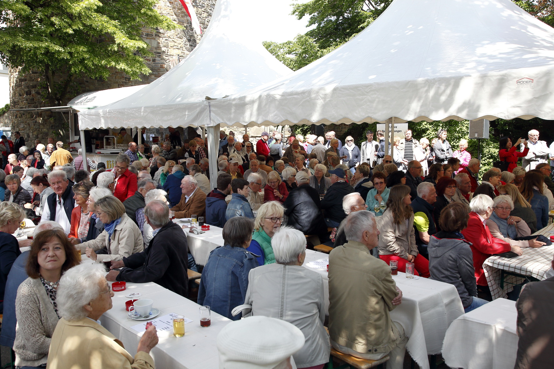 Besonders gefragt und jedes Mal „ausgebucht“ waren die stündlichen Turmführungen. Die Jonges Klaus Hamacher, Guido Multhaupt und Karl-Heinz Dahmen erklärten den staunenden Besuchern nicht nur die Geschichte des ältesten und mächtigsten Ratinger Wachturms, sondern schilderten auch anschaulich dessen aufwendige Sanierung und bauliche Besonderheiten. „Das ist schon eine stramme Leistung, was die Jonges aus diesem Turm gemacht haben“, lobte anerkennend ein Alt-Ratinger, nachdem er das Bauwerk erstmals von innen besichtigt hatte. Bis in den späten Nachmittag wurde auf dem Gelände rund um den Dicken Turm gefeiert. Entsprechend positiv fiel auch die Bilanz von Jonges-Baas Georg Hoberg aus: „Es ist wirklich fantastisch, dass unser Turmfest so gut von der Bevölkerung angenommen wurde und dass so viele gekommen sind, mit uns zu feiern.“