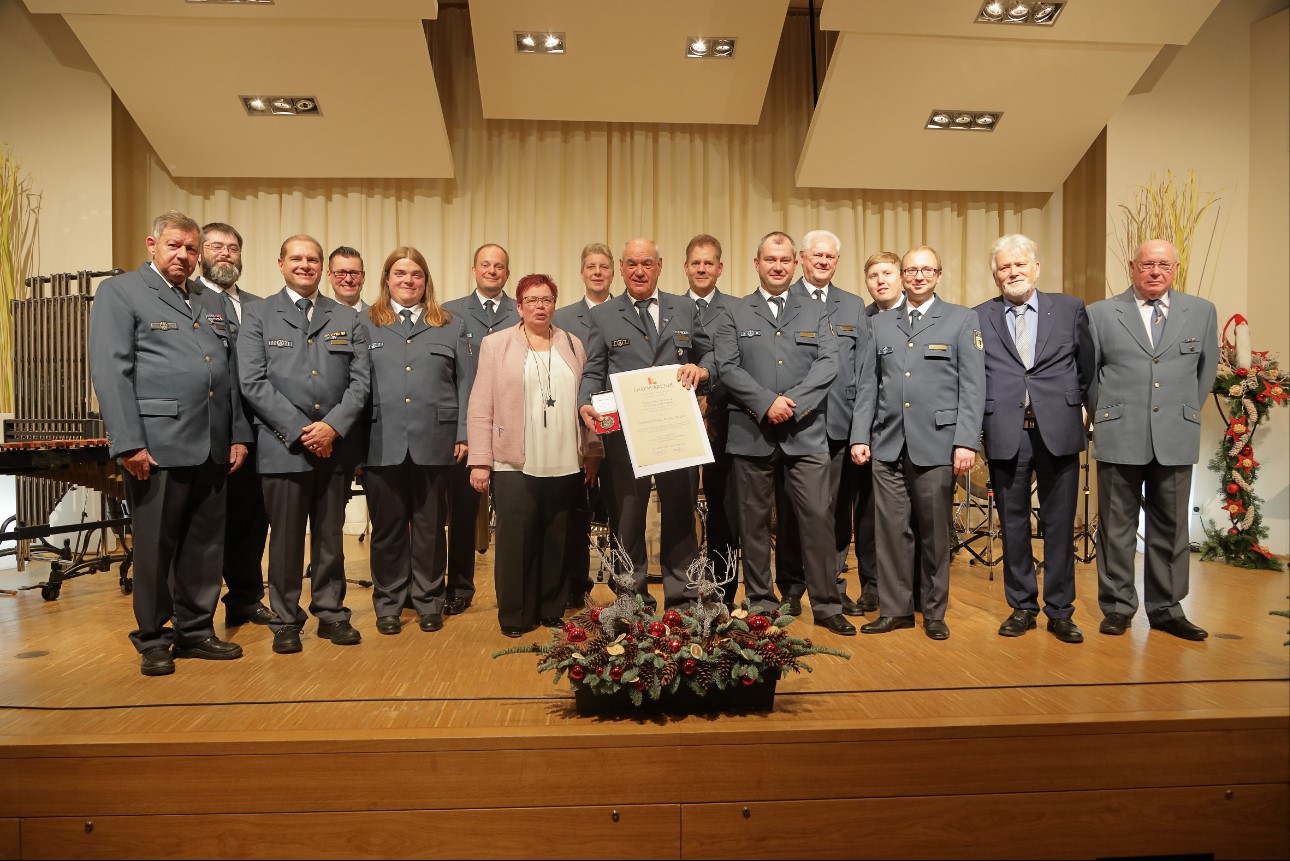 Baas Georg Hoberg (l.) und Vizebaas Edgar Dullni (r.) überreichten im Beisein des THW-Landesbeauftragten Hans Ingo Schliwienski die Urkunde und Dumeklemmerplakette an Gerhard Gärtner vom THW-Ortsverband Ratingen (2.v.r.). Foto: Volkmar Schrimpf