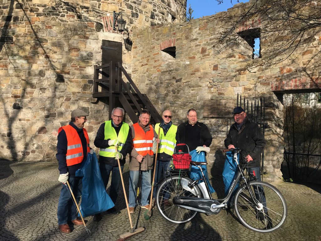Eine Gruppe mit Vizebaas Edgar Dullni sammelte zunächst am Ehrenfriedhof an der Werdener den herumliegenden Müll und Dreck ein, dann ging es am Stadtgraben rund um den Dicken Turm weiter. Am Ende waren drei große blaue Müllsäcke gefüllt.