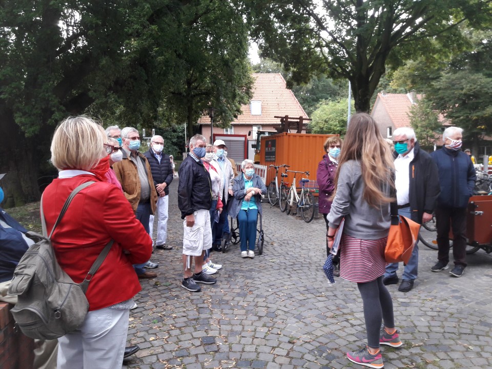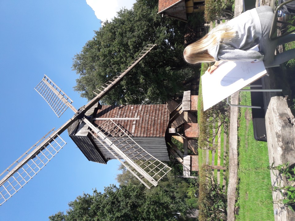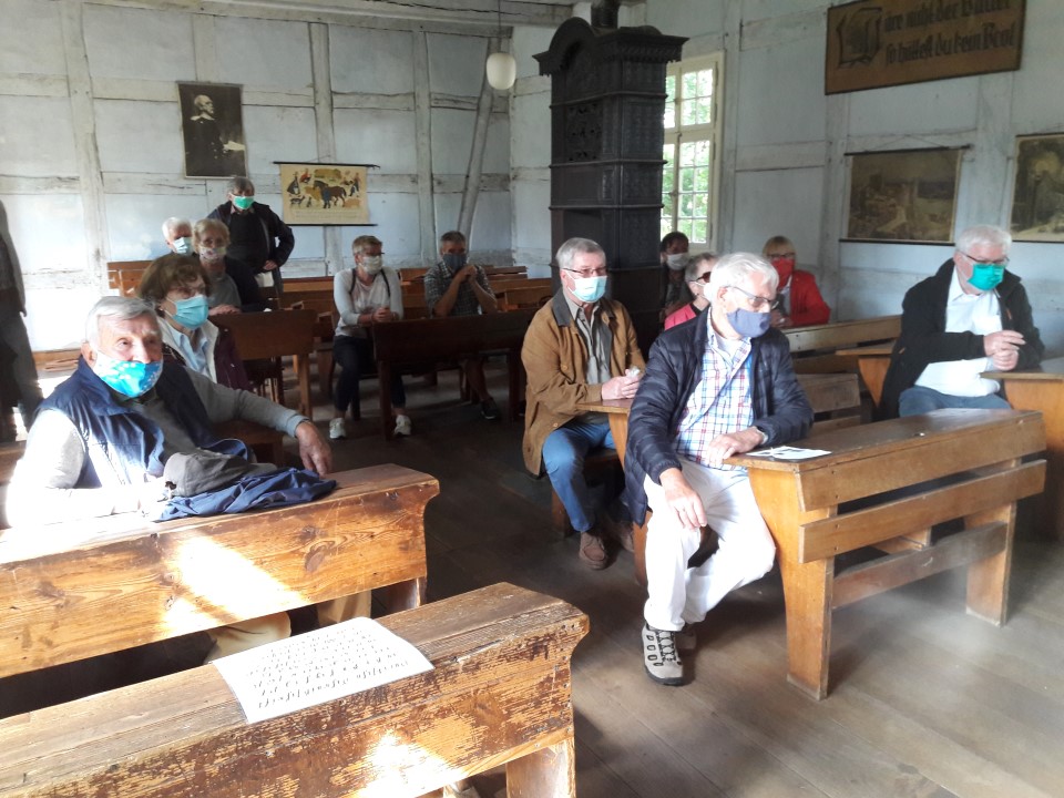 Anschließend ging es mit dem Bus weiter zum Freilichtmuseum Mühlenhof direkt am Aasee. In dem Freilichtmuseum wurden 30 historische Bauten von ihren ursprünglichen Orten in Westfalen in das Museum versetzt oder nach alten Vorbildern rekonstruiert. Auch hier ging es in zwei Gruppen auf Erkundungsgang. Vorbei an der Rossmühle (angetrieben durch Pferde) und der Bockwindmühle passierten wir unter anderem die alte Schmiede, das Bienenhaus sowie das Backhaus und kamen so zum Mühlenhaus aus dem Jahre 1619, welches das älteste Bauwerk des Freilichtmuseums ist. Dort wurden wir über das harte Leben der ehemaligen Bewohner auf einem Bauernhof – gemeinsam mit den Tieren unter einem Dach – aufgeklärt. Lustiger ging es dagegen in der ehemaligen Landschule zu, in der wir uns in die engen Schulbänke quetschten und während des „Musikunterrichts“ das Lied vom wandernden Müller singen durfte – natürlich unter Berücksichtigung der vorgeschriebenen Hygieneabstände.