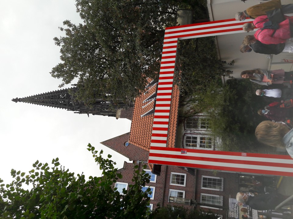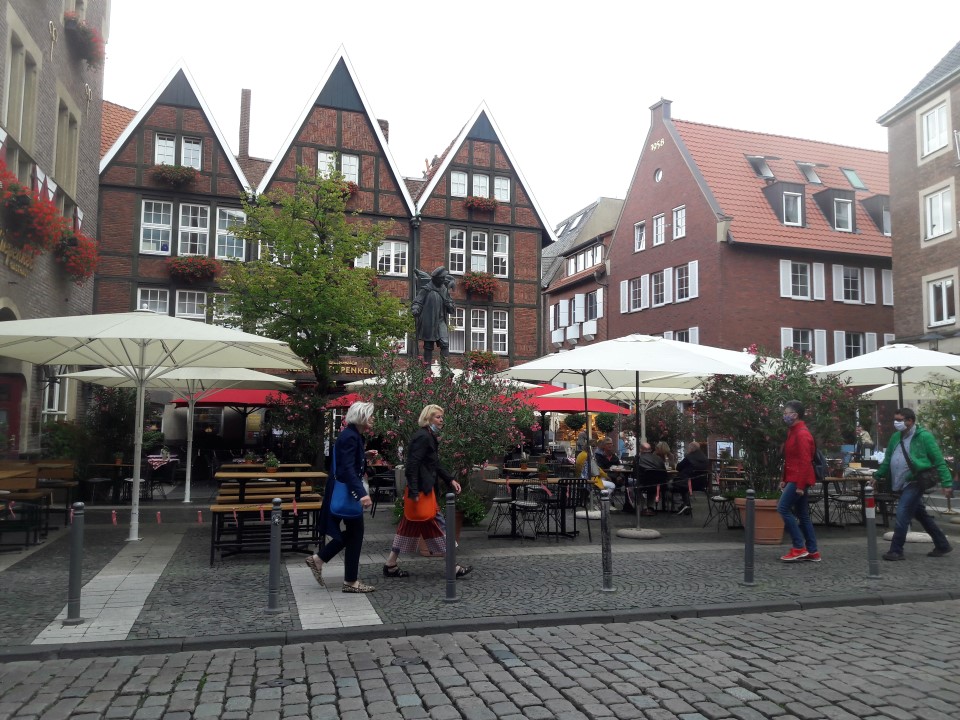 Während des eineinhalb stündigen Rundgangs erfuhren wir von unsere beiden Stadtführern viel über die Geschichte der Stadt, die inzwischen schon gut 1500 Jahre besteht. Hatte sie – neben Osnabrück – den 30jährigen Krieg ohne Schäden überstanden, wurde sie im 2. Weltkrieg extrem zerstört, im Altstadtbereich aber vielfach (fast) originalgetreu wieder aufgebaut. Darunter auch das Rathaus mit dem Friedenssaal, in dem 1648 nach einer gut fünf Jahre dauernden Beratung zwischen den verfeindeten Gruppen der Westfälische Friede geschlossen wurde, mit dem der Dreißigjährige Krieg und der Achtzigjährige Krieg (zwischen den Niederlanden und Spanien) beendet wurden.