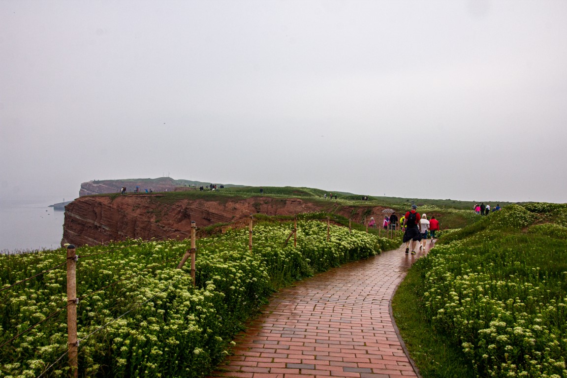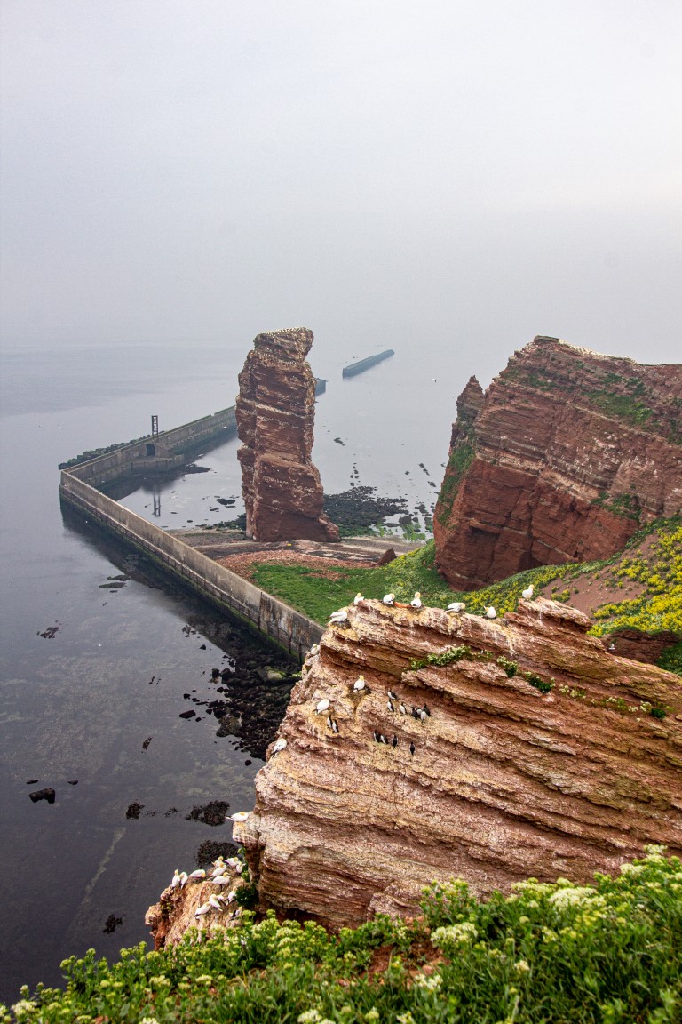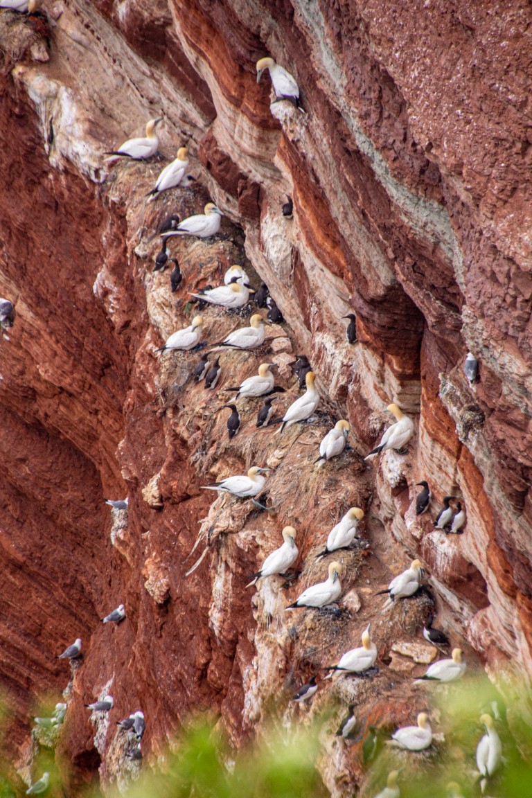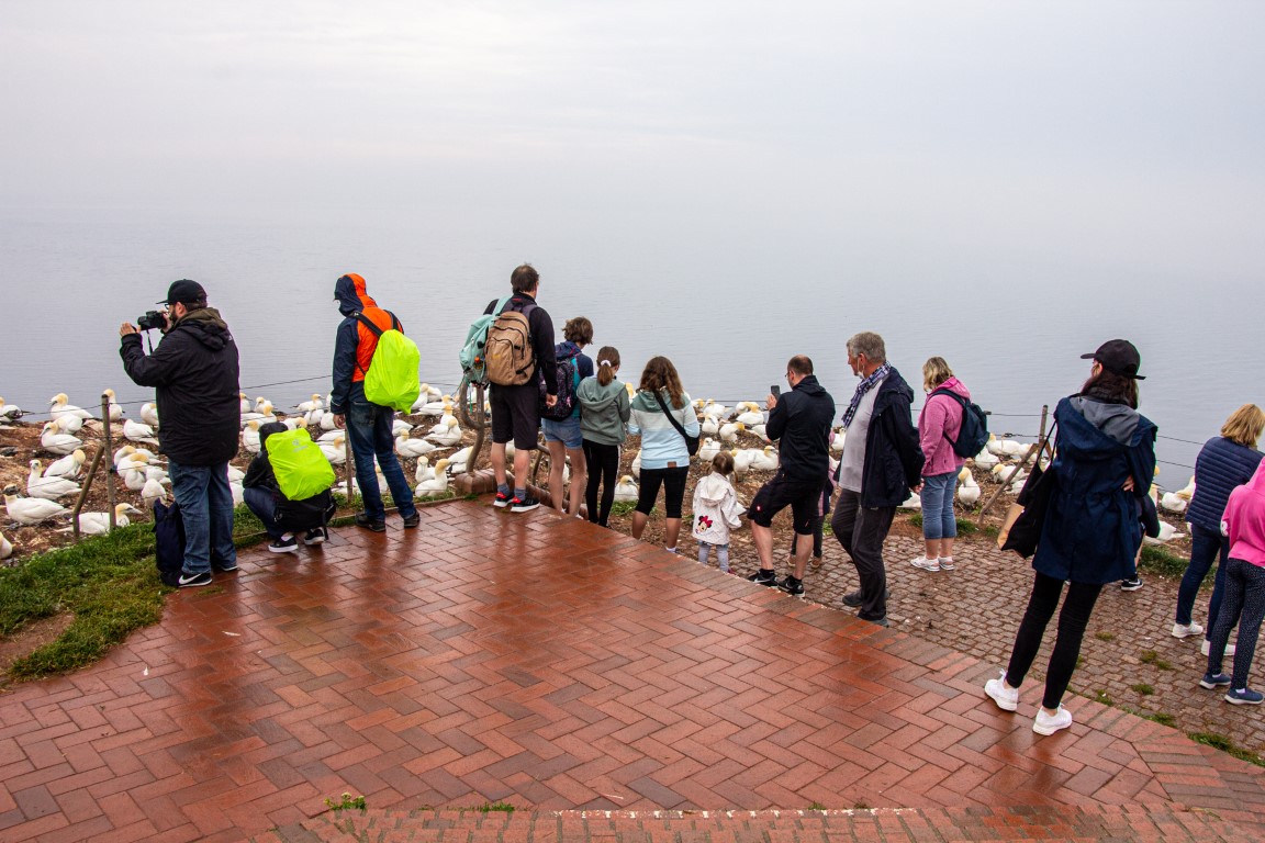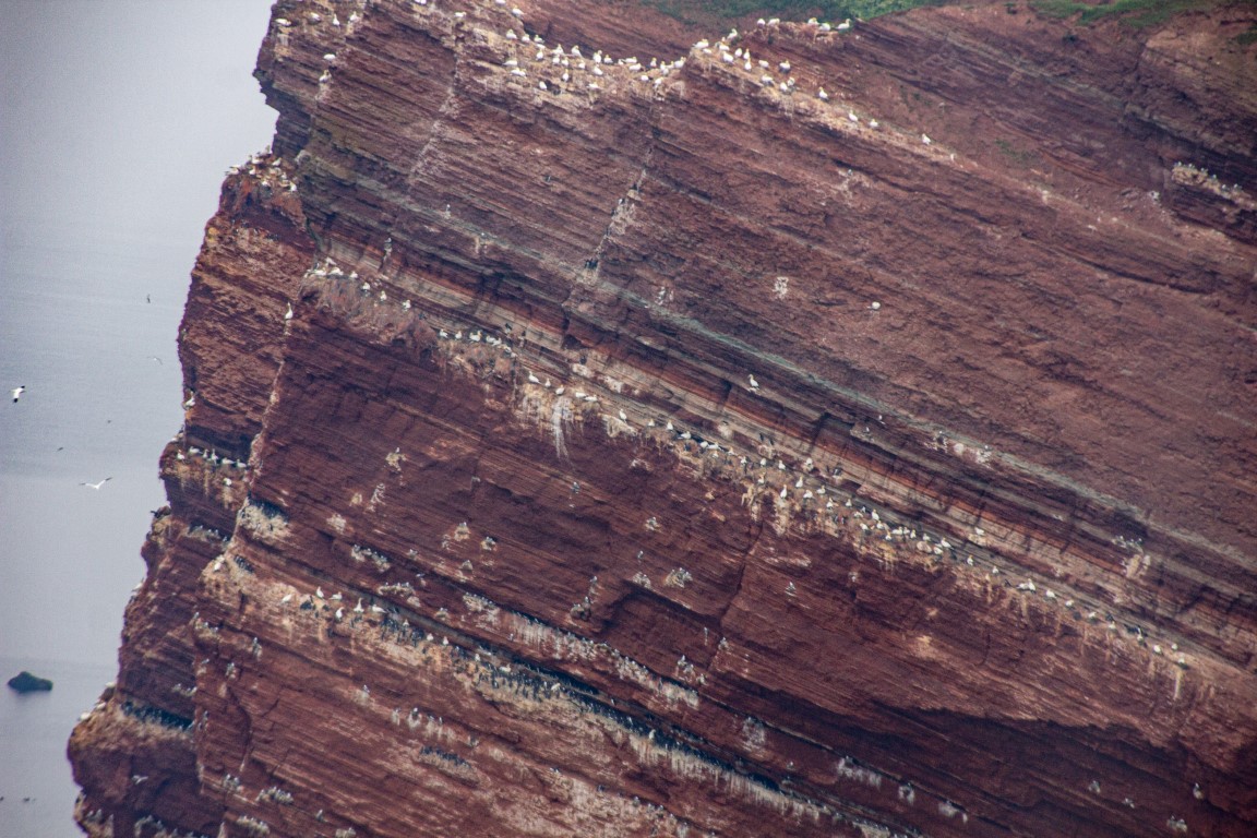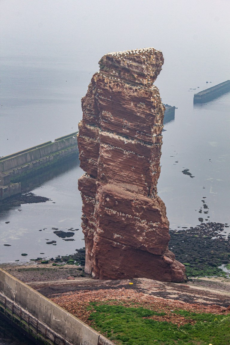 Die einen wählten den teils recht steilen Weg hoch, andere den langen Weg zum Ortszentrum und dort den Aufzug zum 50 Meter höher liegenden Oberland. Hauptziel sind bei dem Inselrundgang natürlich am nördlichen Ende der Insel die Blicke auf die „Lange Anna“, ein 47 Meter hoher, frei stehender Felsen, und der von tausenden Seevögeln bevölkerten Lummenfelsen gleich nebenan an der Steilküste. Neben den Trottellummen und Dreizehenmöwen sind jedoch die Basstölpel die Hauptbewohner der Felsen, die sogar unmittelbar neben dem Weg ihre Nester bezogen haben und sich von den vielen Touristen auch beim Brüten nicht stören lassen. Dieser Bereich hier oben war auch nach Meinung aller Mitreisenden der schönere und lohnenswerte Teil der Hauptinsel. Überall wuchs blühende Schafsgarbe und setzte weiße Tupfer auf dem grünen Bewuchs. Die leicht kraterähnliche Landschaft rührt von der Bombardierung der Inseln durch die Briten während und nach dem 2. Weltkrieg, worauf auch Schilder hinweisen – ebenso auf den Trichter durch eine 5000 kg-Bombe.