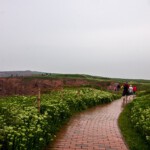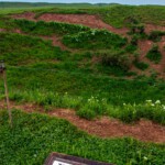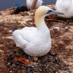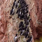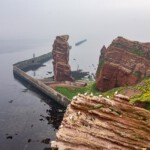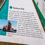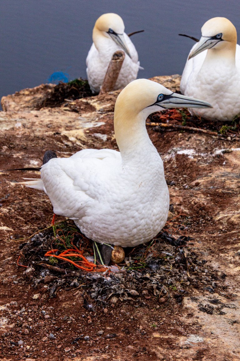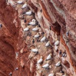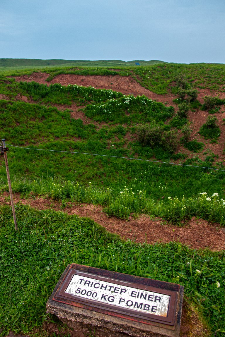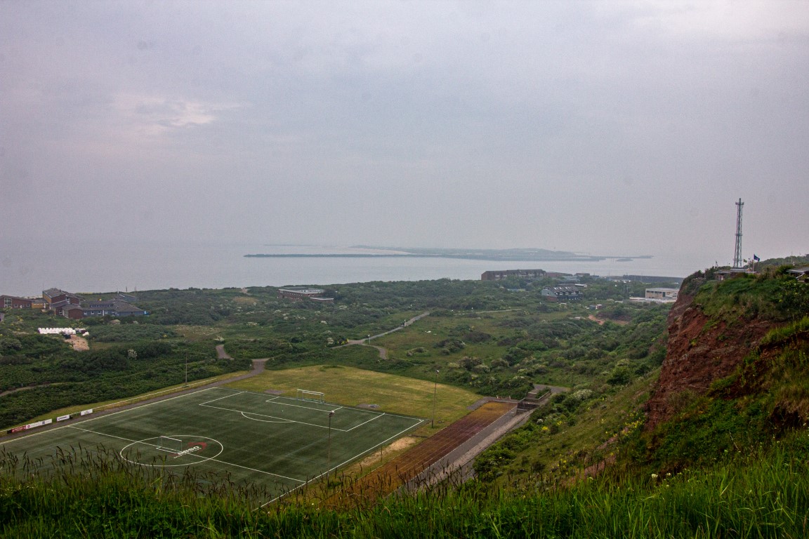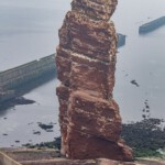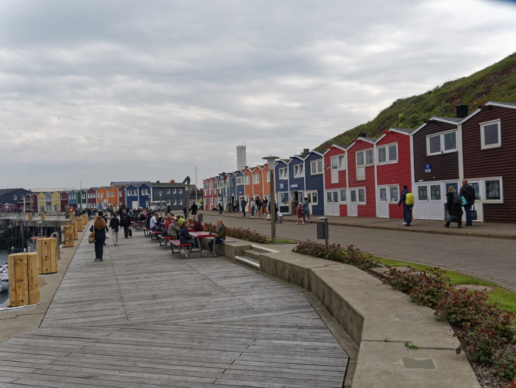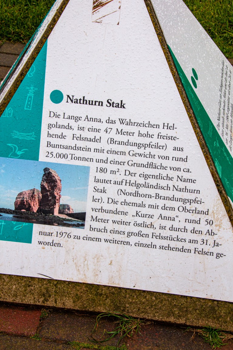 Die einen wählten den teils recht steilen Weg hoch, andere den langen Weg zum Ortszentrum und dort den Aufzug zum 50 Meter höher liegenden Oberland. Hauptziel sind bei dem Inselrundgang natürlich am nördlichen Ende der Insel die Blicke auf die „Lange Anna“, ein 47 Meter hoher, frei stehender Felsen, und der von tausenden Seevögeln bevölkerten Lummenfelsen gleich nebenan an der Steilküste. Neben den Trottellummen und Dreizehenmöwen sind jedoch die Basstölpel die Hauptbewohner der Felsen, die sogar unmittelbar neben dem Weg ihre Nester bezogen haben und sich von den vielen Touristen auch beim Brüten nicht stören lassen. Dieser Bereich hier oben war auch nach Meinung aller Mitreisenden der schönere und lohnenswerte Teil der Hauptinsel. Überall wuchs blühende Schafsgarbe und setzte weiße Tupfer auf dem grünen Bewuchs. Die leicht kraterähnliche Landschaft rührt von der Bombardierung der Inseln durch die Briten während und nach dem 2. Weltkrieg, worauf auch Schilder hinweisen – ebenso auf den Trichter durch eine 5000 kg-Bombe.