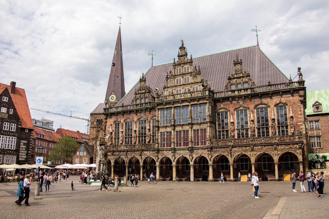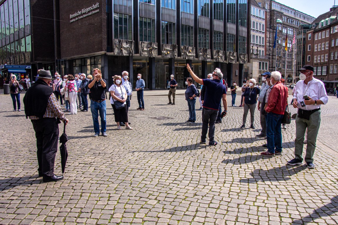 Dementsprechend ging es mit guter Stimmung nach Bremen, wobei die vielen Staus durch den feiertagsbedingten Reiseverkehr nicht störten. Bei der Stadtführung ging es sogleich zum Marktplatz mit dem historischen Rathaus und der Rolandsfigur, wir besuchten die Bremer Stadtmusikanten und besichtigten auch das berühmte Schnorrviertel wie auch die Böttcherstraße mit ihrem bekannte goldenen Fassadenrelief „Der Lichtbringer“. Wer wollte, konnte dann noch den St. Petri-Dom aufsuchen oder in den dort bereits geöffneten Kneipen ein leckeres Bier genießen.
