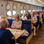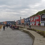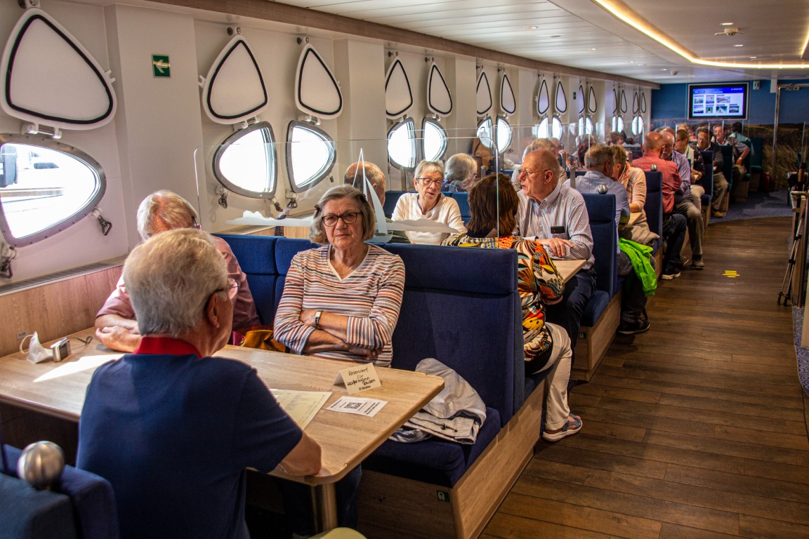 Natürlich gehörte zu einem Besuch auf Helgoland auch der Genuss eines Fischbrötchens oder ein leckerer Fischteller und selbstverständlich auch der Einkauf der hier zollfreien Waren. Bei den erlaubten Höchstmengen half man sich gegenseitig aus: Wer nicht raucht oder keine alkoholische Getränke mag, bot seine Freimenge eben dem anderen an. Zurück zum Schiffsanleger passierte man den ehemaligen Hafen für die Bordeboote, noch einige Geschäfte mit der letzten Möglichkeit zum zollfreien Einkauf und die lange kunterbunte Reihe von Ferienhäusern. Das Wetter hatte zwar zwischendurch etwas aufgeklart, aber die Sicht war immer noch dunstig und so entschwand die Insel schnell aus unserm Blick. Das Meer blieb ungewöhnlich ruhig, weshalb manche das Erlebte noch einmal innerlich vorüberziehen ließen. Es war trotz des Regens ein schöner Ausflug gewesen.