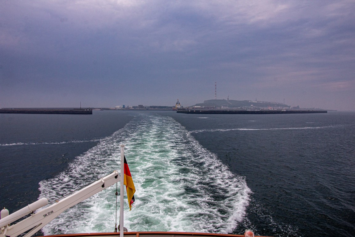 Früh ging es los nach Cuxhaven, wo unsere Überfahrt nach Helgoland begann. Das Wetter hatte sich leider stark verschlechtert. 2 ½ Stunden Fahrzeit liegen vor uns und während langsam das Festland im trüben Wetter hinter uns aus der Sicht entschwand, passierten wir bei der Fahrt zuerst durchs Wattenmeer noch die Inseln Neuwerk, Scharhörn und Nigehörn, die zum Stadtstaat Hamburg gehören, obwohl sie geografische eigentlich im Bereich von Niedersachsen liegen. Schließlich erreichten wir das Hochseegebiet der Nordsee und durften uns über eine fast spiegelglatte Seeoberfläche freuen. Erst kurz vor unserer Ankunft tauchte die Insel aus dem Trüben auf, und kaum hatten wir wieder festen Boden unter den Füßen, fing es an zu regnen - zum Glück nur leicht.