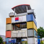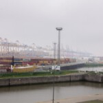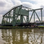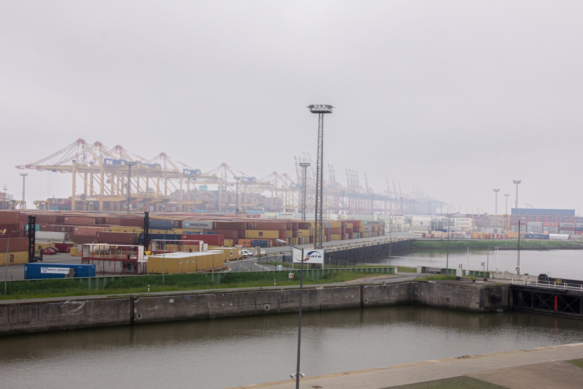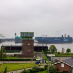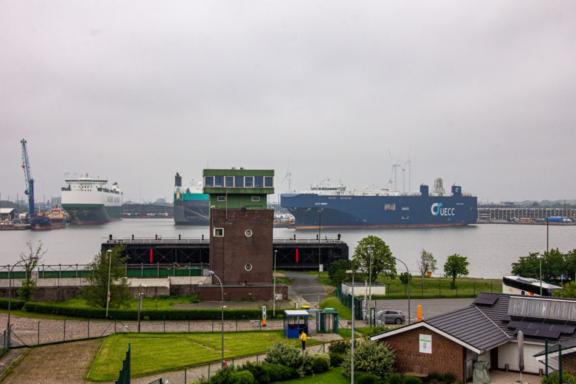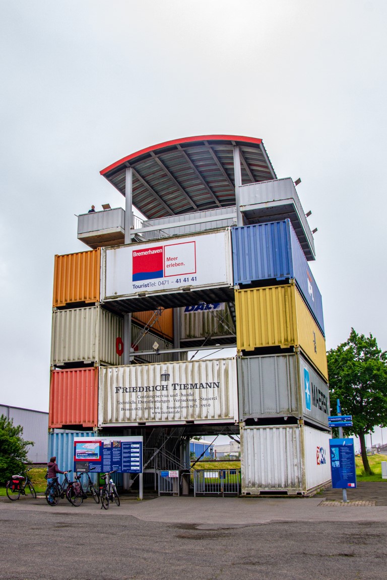 Vom Hotel aus ging es direkt in den Überseehafen, der zur Stadt Bremen gehört, aber auch als Freihafen ein zollrechtliches Sondergebiet mit Grenzzaun und -übergängen umfasst. Unser erstes Tagesziel war der Container-Aussichtsturm, der nur aus übereinander gestapelten Containern mit einer Plattform oben besteht. Es bot sich eine tolle Übersicht über das gesamte Gelände: Auf der einen Seite die große Nordschleuse und entlang der Weser die lange Reihe der Kräne des Containerterminals, auf der anderen Seite etwas entfernt der Autoport mit den riesigen Transportschiffen. Vor einem die noch aus den 1930er-Jahren stammende Eisenbahn-/Auto-Drehbrücke (Nordschleusenbrücke), die jedoch altersbedingt abgerissen wird.