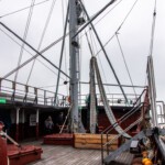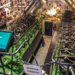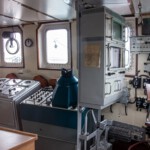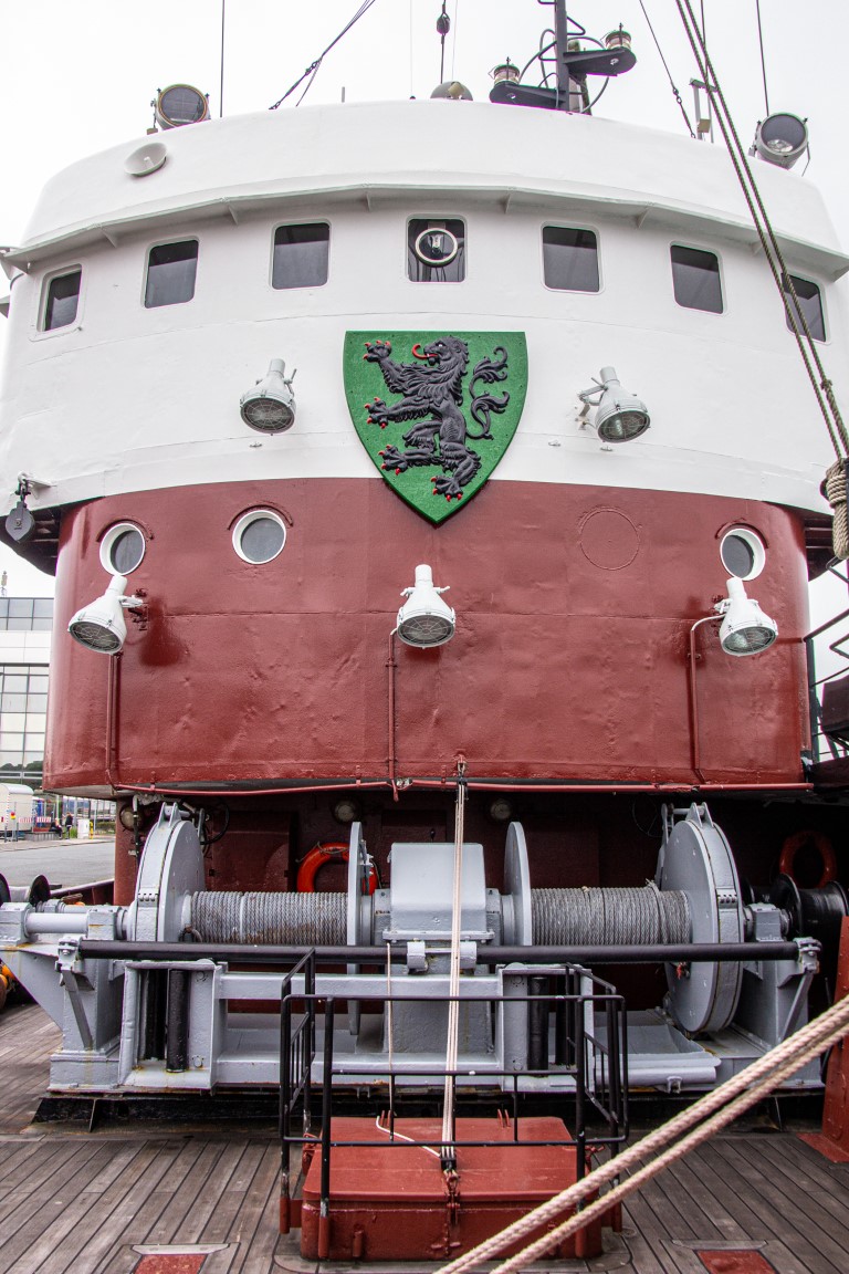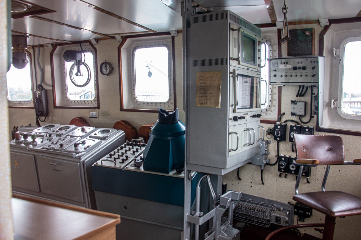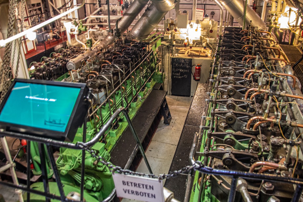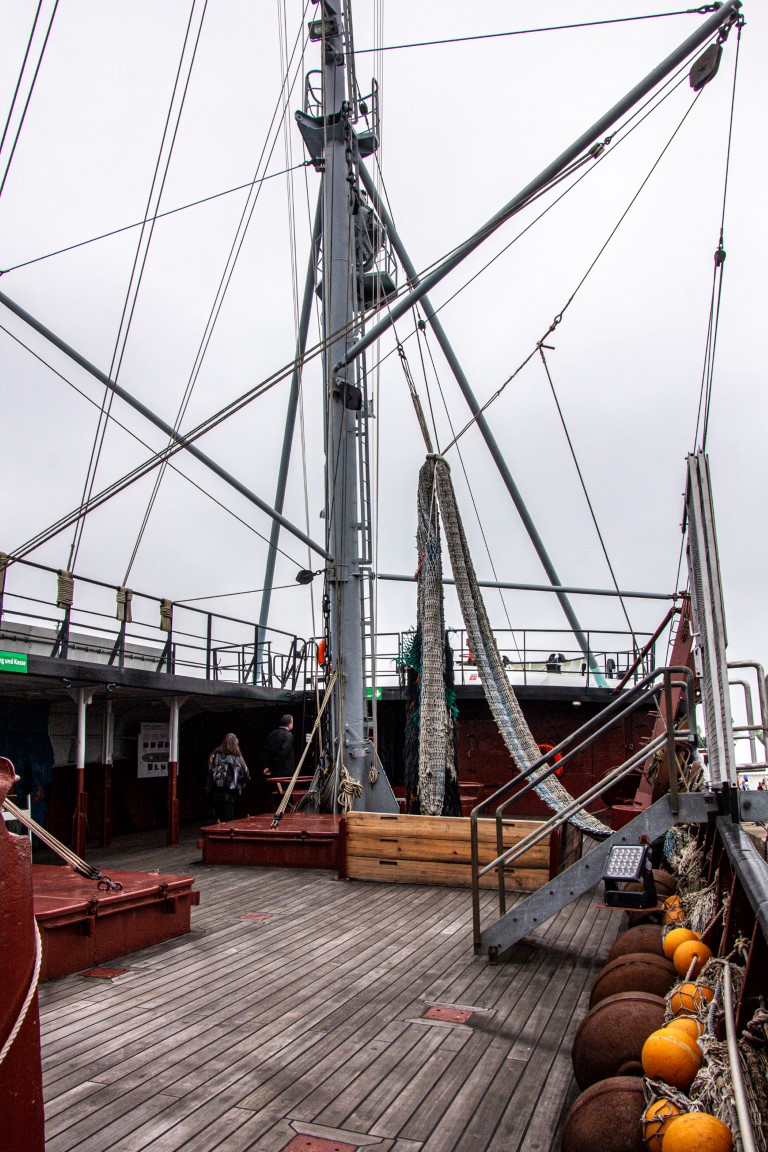 1924 hatten 155 Fischdampfer hier ihren Heimathafen. Bis in die 1960er-Jahre hinein war es der größte auf dem europäischen Festland, wobei es 1967 noch 85 Seitenfänger gab. Mit dem Aufkommen der Fabrikschiffe sank jedoch die Bedeutung von Bremerhavens Fischereihafen und heutzutage wird hier nur noch der tiefgefrorene Fisch aus den Fabrikschiffen verarbeitet. Aber es gibt immer noch einen „Seitenfänger“ (das sind die Fischerboote, die das Netz mit den gefangenen Fischen seitlich an Bord hieven), der jedoch inzwischen nur als Museumsschiff dient und besichtigt werden kann: die FMS Gera. Eine Führung war leider noch nicht möglich, dafür durften wir uns aber in Gruppen zu je zehn Teilnehmern nach kurzer Einweisung allein auf Entdeckungstour über wie unter Deck begeben, dabei die engen Kabinen für die Mannschaft betrachten und uns fragen, wie man es wochenlang darin aushalten konnte. Auch einen Blick in die Kombüse, den Netz- und in den Fischladeraum konnte man werfen, nur der Zugang zur Brücke blieb gesperrt. Für die Technik-Interessierten war jedoch der Blick in den Maschinenraum mit der großen Dieselmaschine lohnend. Interessanterweise stammt die Gera eigentlich gar nicht aus Bremerhaven, sondern wurde 1990 noch vor der Wiedervereinigung von der Stadt für 1 D-Mark vom Fischkombinat Rostock gekauft, das das Schiff eigentlich verschrotten wollte. Somit liegt das letzte noch erhaltene Exemplar der traditionsreichen Fangflotte der Seitentrawler nun hier im Hafenbecken.