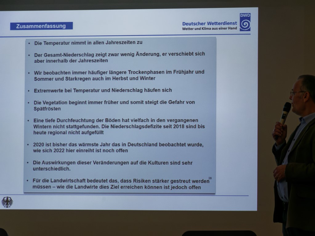 39 Jonges incl. weiblicher Begleitung starteten am ziemlich frühen Morgen per Bus am Ostbahnhof; sie wurden während der Fahrt von Jong U. Otte als früherem DWD-Mitarbeiter auf den Besuch eingestimmt. Am Vormittag machten DWD-Mitarbeiter/-innen die interessiert zuhörenden Teilnehmer mit Kernelementen der Wettervorhersage und Wetterwarnung sowie dem Klimawandel allgemein und seinen Wechselwirkungen mit der Landwirtschaft vertraut.