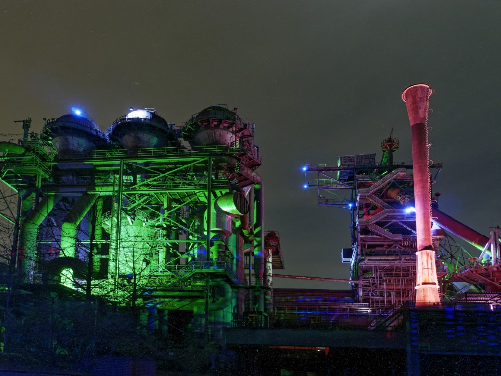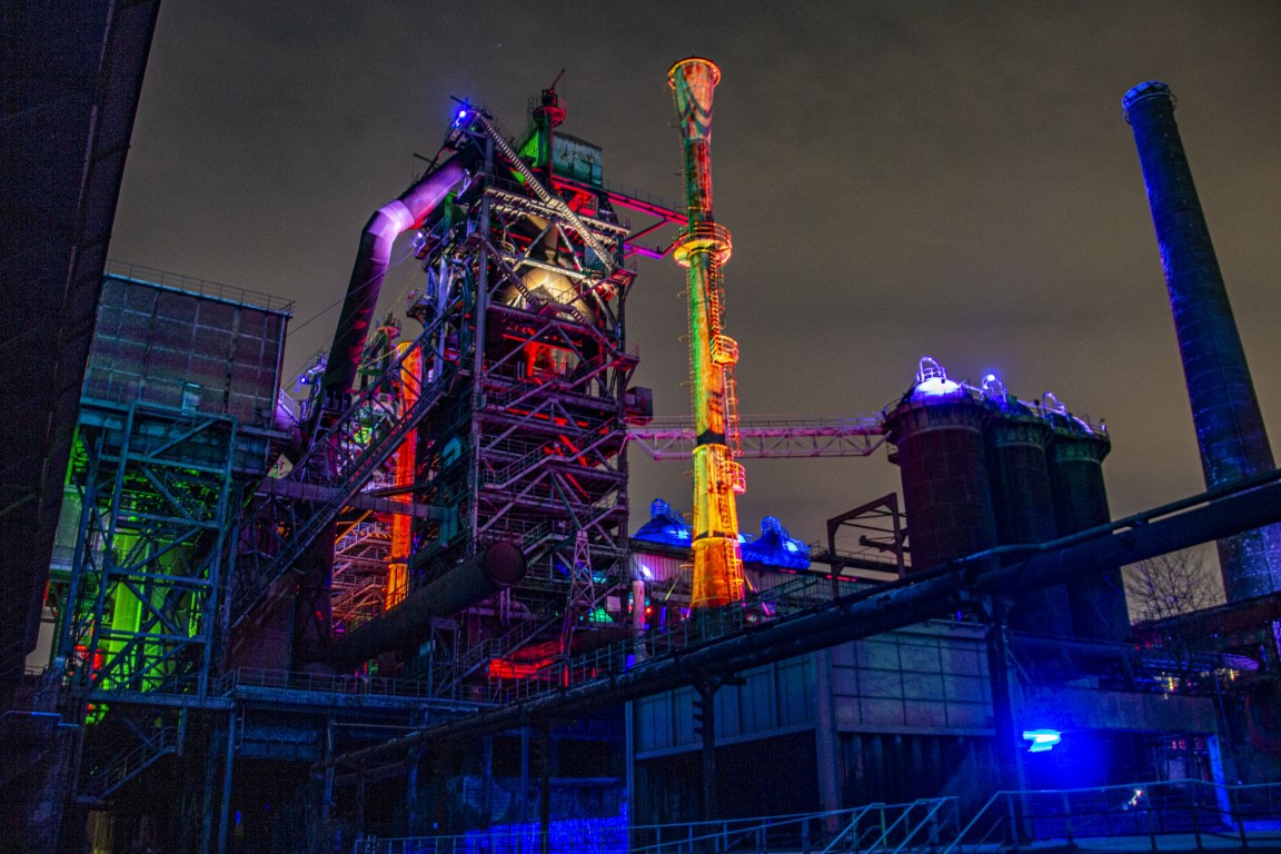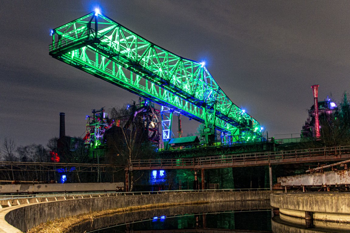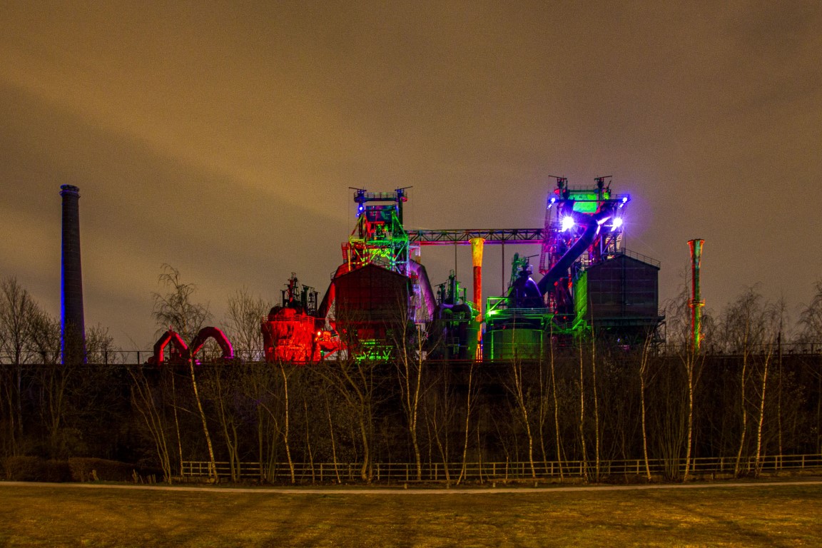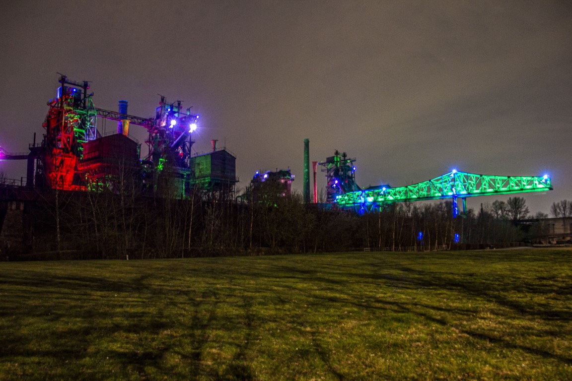 Nicht umsonst hatte der Reisebaas der Jonges diese späte Stunde für den Ausflug gewählt, denn mit Einbruch der Dunkelheit wurden die verschiedenen Gewerke im Hüttenwerk farbenprächtig illuminiert. Ein Großteil der Teilnehmer nutzte die Zeit bis zur Abfahrt zu einem privaten Rundgang, wobei besonders die grüne Beleuchtung des „Krokodiles“ (ein ehemaliger Verladekran) ein Highlight war, das entsprechend intensiv fotografiert wurde.