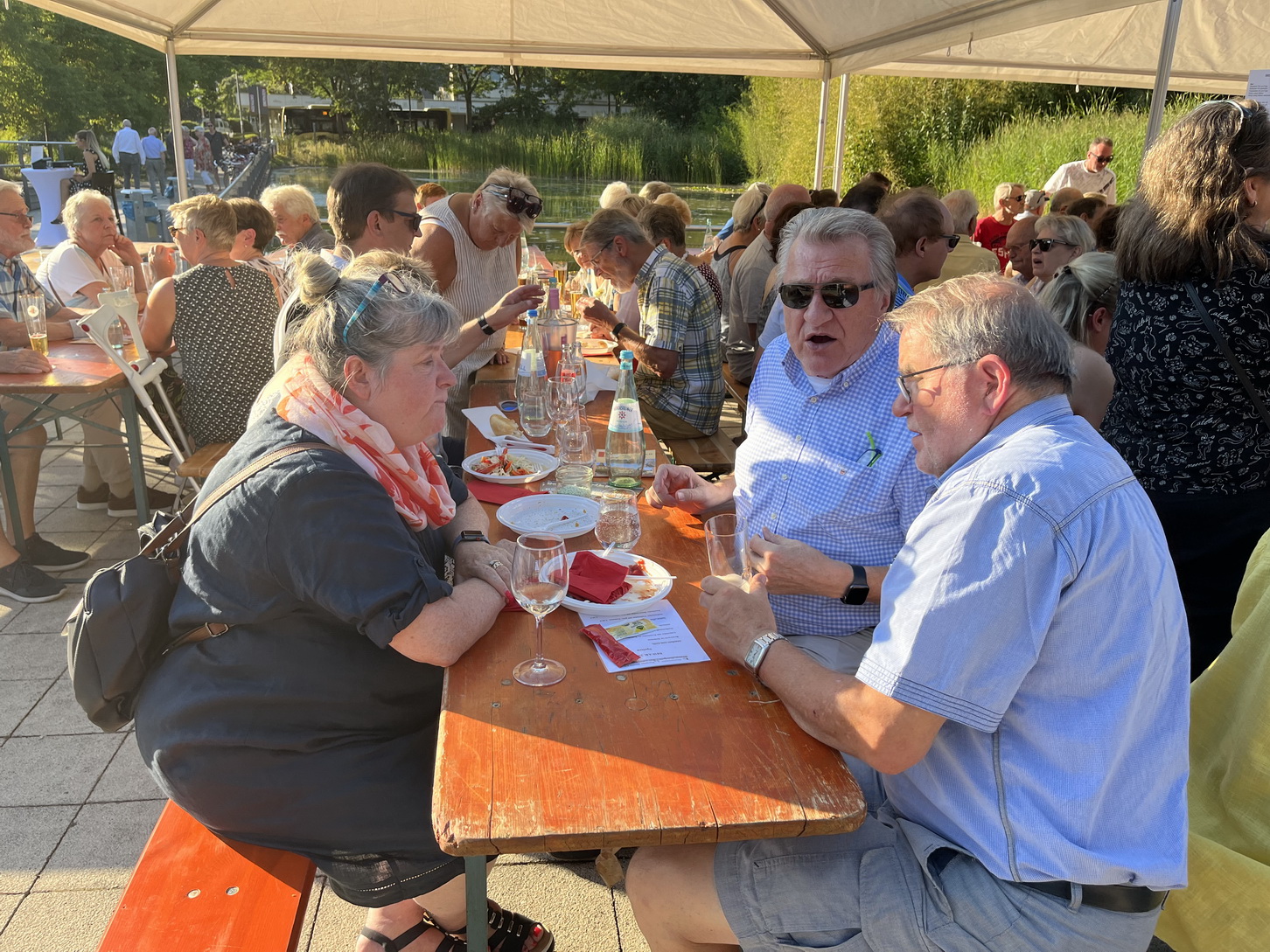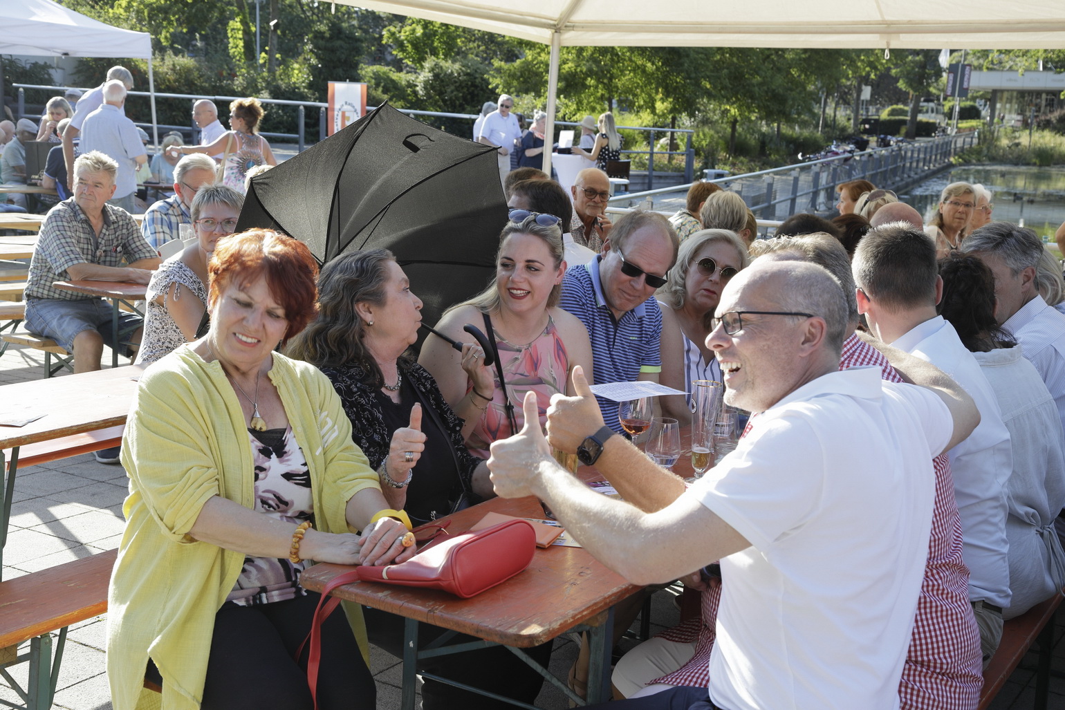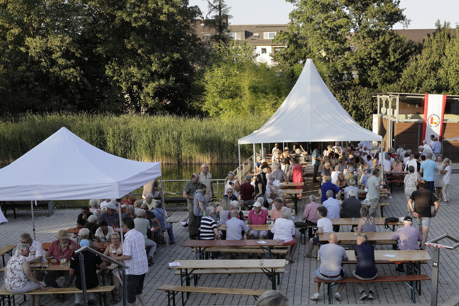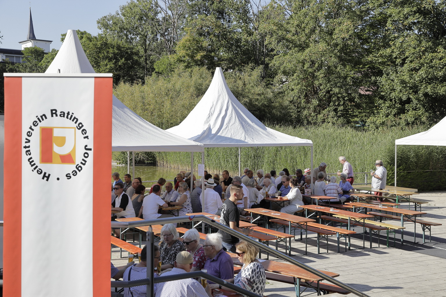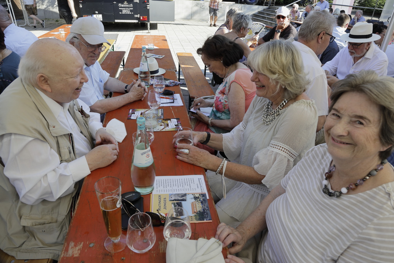 Rund 300 Besucher und Gäste tummelten sich bis in die späten Abendstunden in dem ansprechenden Ambiente, genossen die (sehr) warme Sommernacht bei kühlen Getränken und leckeren Snacks vom Stadthallen-Caterer. „Insgeheim hatte ich auf eine noch bessere Besucherzahl gehofft‟, sagte Dullni. Vermutlich habe die Hitze mit über 30 Grad aber doch noch viele abgehalten, hierher zu kommen. Die Resonanz auf den neuen Standort sei aber durchweg positiv gewesen. Auch das Unterhaltungsprogramm mit der Gesangstruppe „Hahnenschrei‟ der Roten Funken, dem Ratinger Nachwuchsmusiker Alex Seidl und einem DJ kam bei den Gästen prima an.
