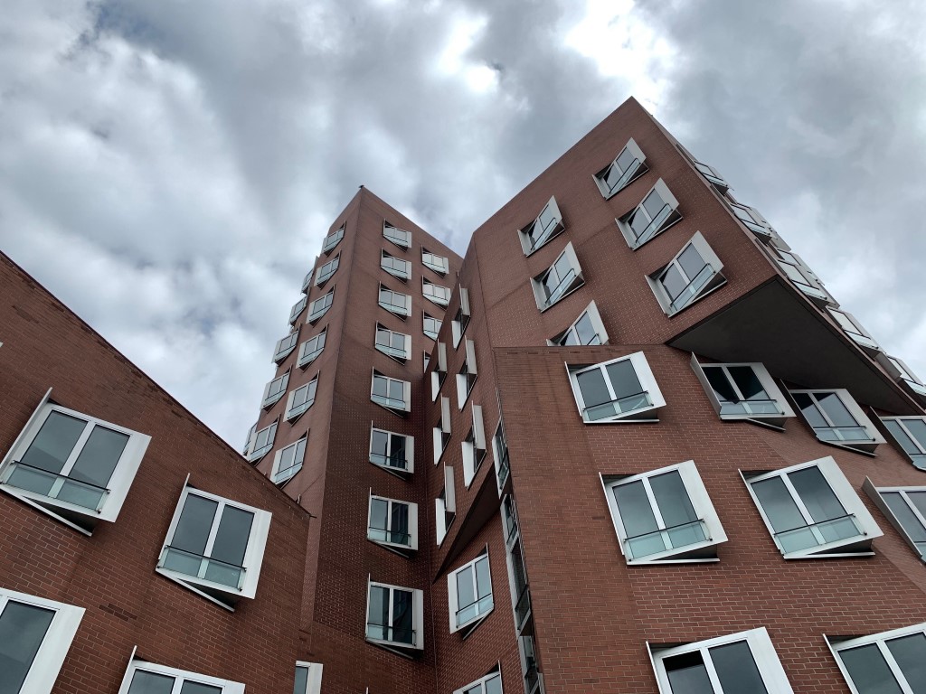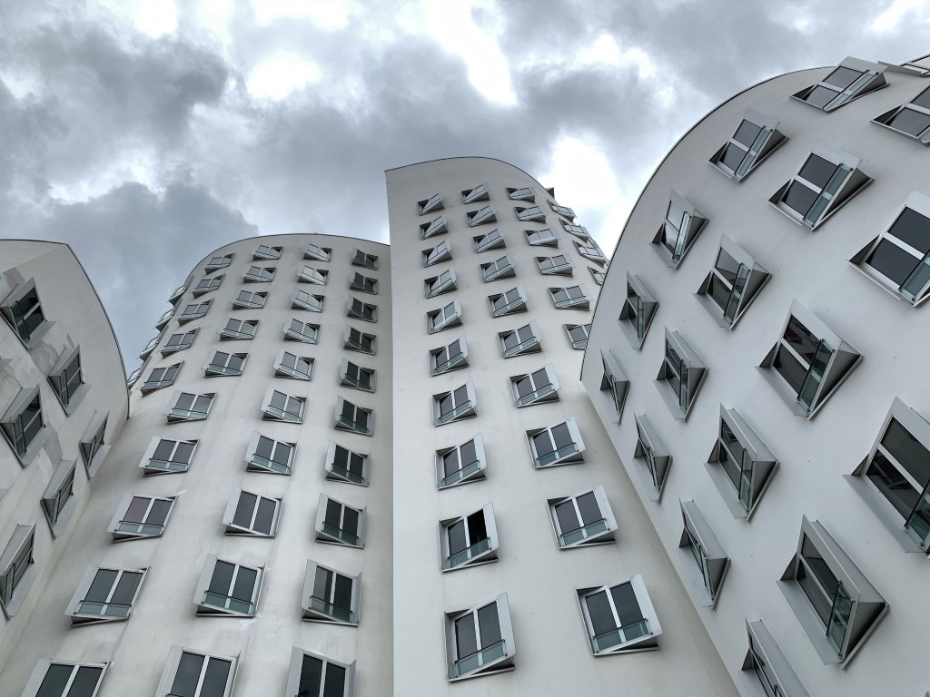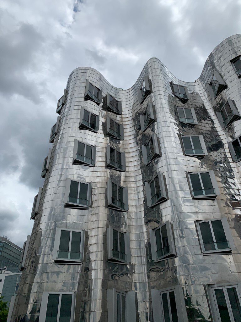 Hauptziel war bei der Rundfahrt der inzwischen berühmte Medienhafen mit den krummen und silbern schimmernden Gerrybauten, durch den es anschließen zu Fuß auf Exkursion ging.