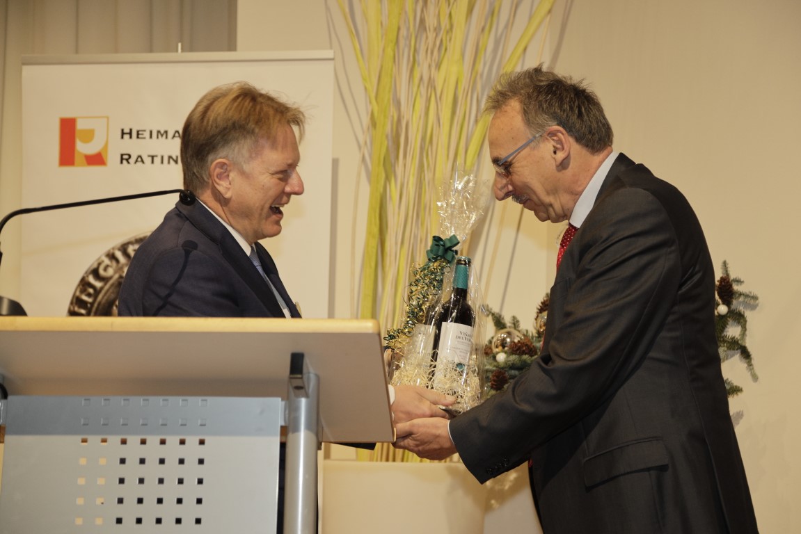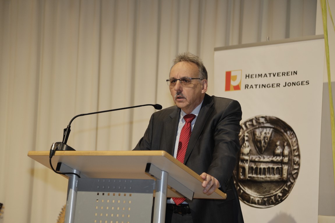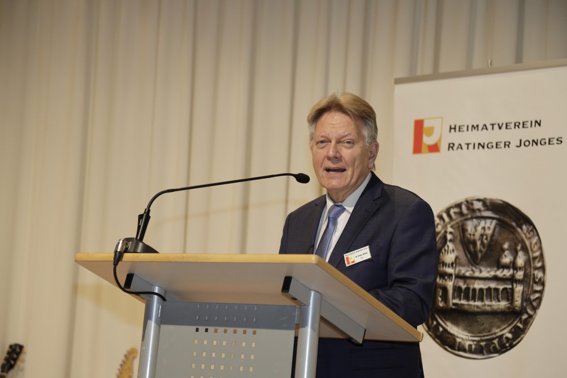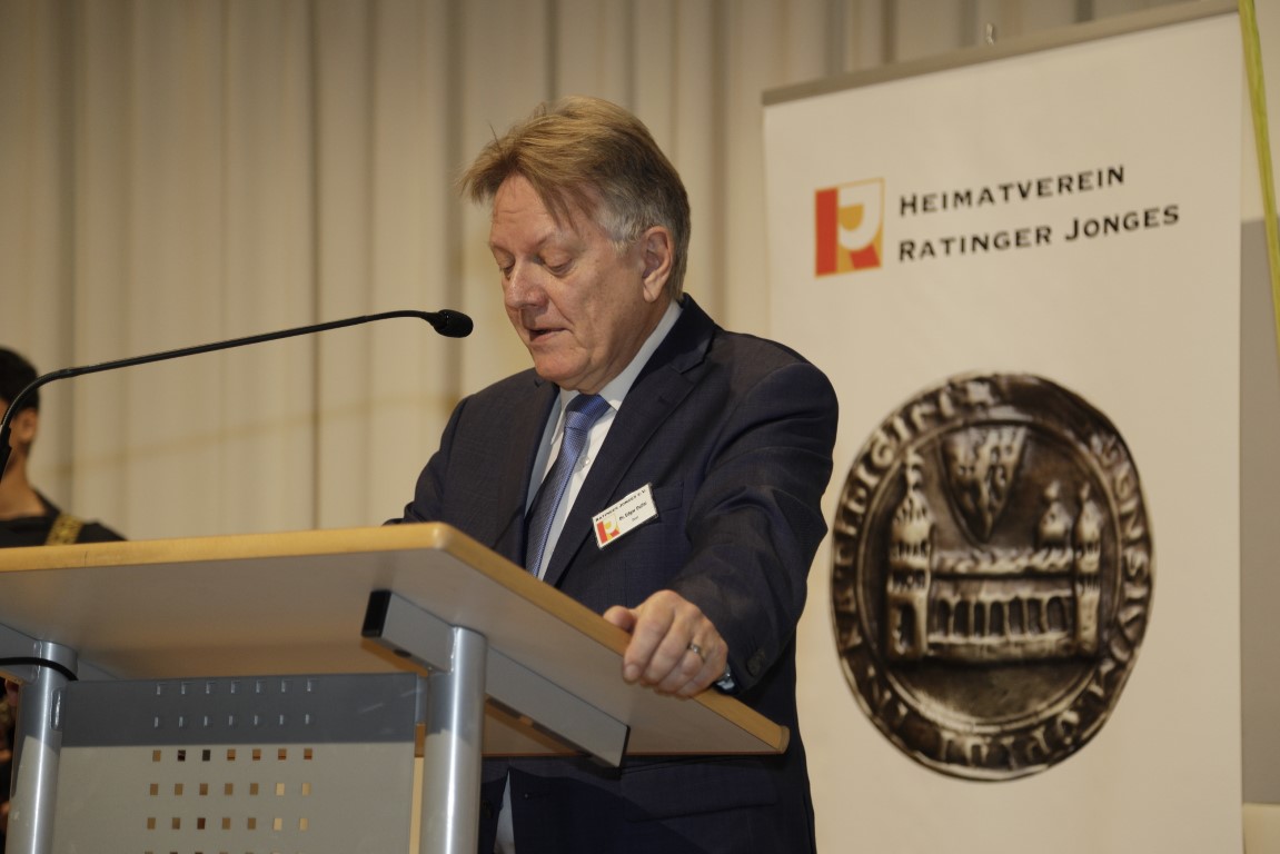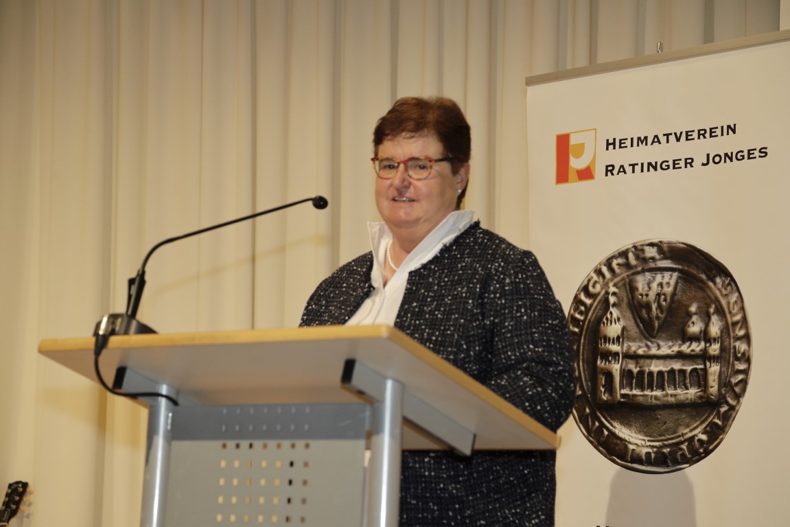 In seiner unterhaltsamen und kurzweiligen Laudatio zeichnete Dr. Klaus Wisotzky den Lebensweg und das vielfältige Wirken Töpfers nach. Er sprach von der Bedeutung der „Erinnerungsarbeit‟, „traditionellen sozialen Milieus, die Halt geben‟, von „Geborgenheit und Heimat‟ und „Identifikation mit der Stadt‟ – all das träfe auf Andrea Töpfer zu: In Ratingen geboren, übers Elternhaus mit dem heimischen Brauchtum und Sport verbunden, sie war Klassensprecherin, Kinderprinzessin und in der Dekanatsjugend engagiert – kurzum: tief verwurzelt in der Stadtgesellschaft. „Nur wer weiß, wer mit wem verwandt oder verschwägert ist, kann die Ratinger Stadtgeschichte verstehen‟, stellte Wisotzky augenzwinkernd fest, der zustimmende Applaus im Saal gab ihm Recht.