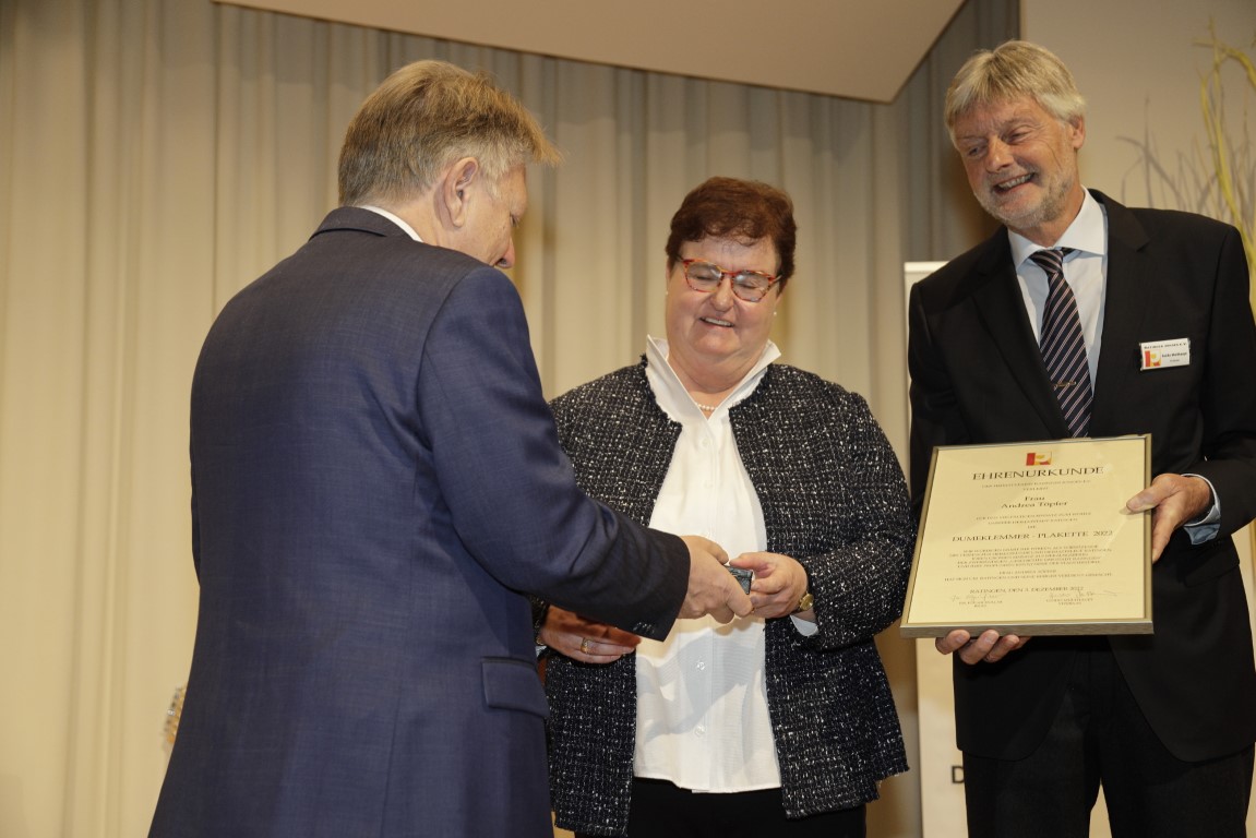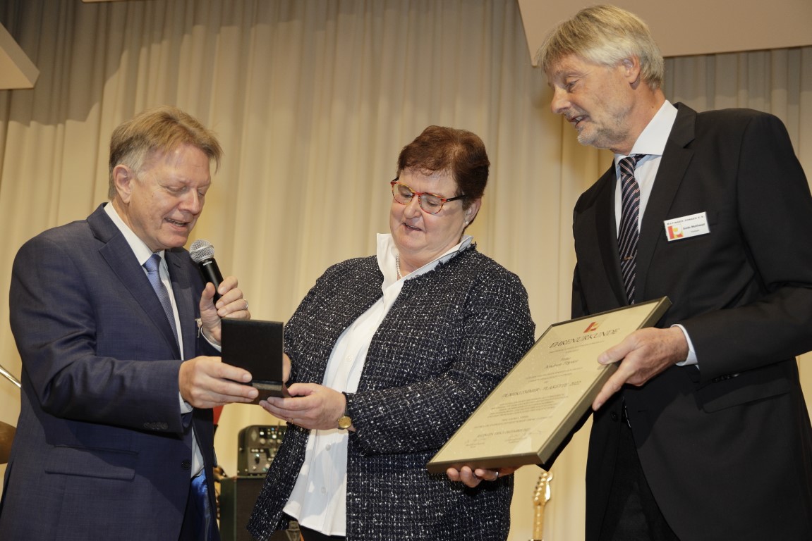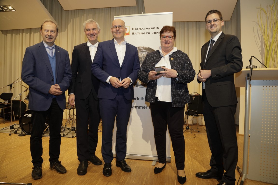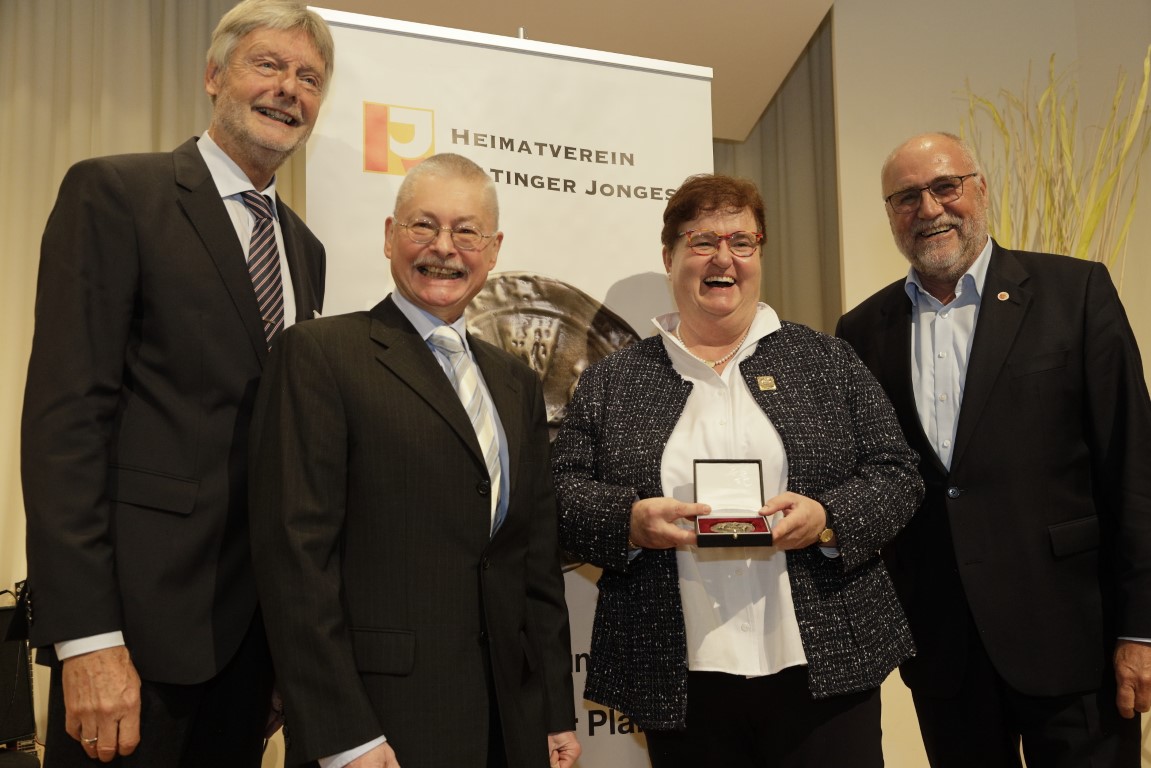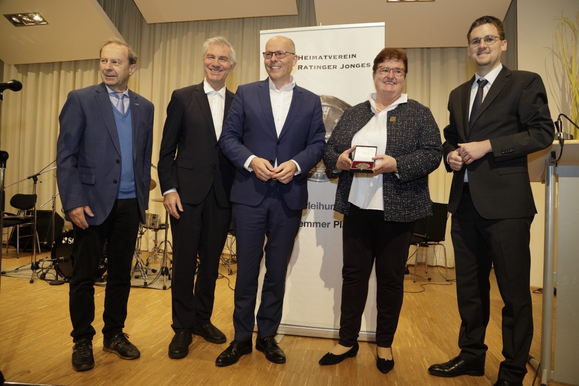 Großer Bahnhof für Andrea Töpfer: Die Leiterin des Kulturamtes und Ehrenvorsitzende des Ratinger Heimatvereins ist von den Ratinger Jonges mit ihrer höchsten Auszeichnung, der Dumeklemmer-Plakette, geehrt worden. Zur Feierstunde im gut gefüllten Ferdinand-Trimborn-Saal waren neben dem Familien- und Freundeskreis zahlreiche Vertreter aus Politik, Wirtschaft, Brauchtum und öffentlichem Leben, aber auch viele ehemalige Plakettenträger gekommen. In seiner Begrüßung würdigte Baas Dr. Edgar Dullni die Preisträgerin „als eine der profundesten Kennerinnen der Historie unserer Heimatstadt‟. In ihrer Zeit als Vorsitzende des Vereins für Heimatkunde und Heimatpflege Ratingen wurden zahlreiche Publikationen rund um die Stadtgeschichte herausgegeben.