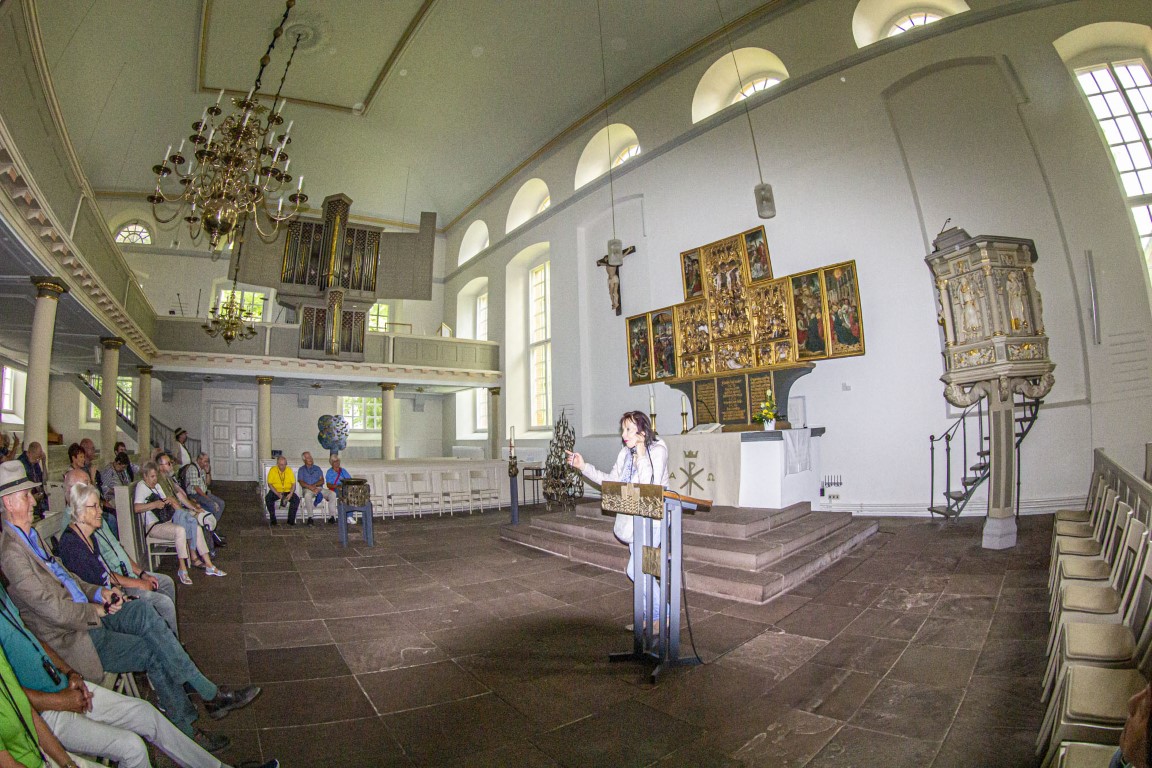 Am dritten Tag der Tour bekamen wir bei einer Stadtführung in Aurich Ostfriesische Impressionen geboten. Bei dem Rundgang lernten wir, dass Aurich früher eine Residenz der ostfriesischen Fürsten war und daher ein Schloss besitzt, in dem jedoch Heute das Landgericht, das Amtsgericht und das Niedersächsische Landesamt für Bezüge und Versorgung untergebracht sind. Ein schönes Motiv bietet auch das alte Landschaftsgebäude, vor dem vier Wasserbecken mit dem Schriftzug "OLL HAVEN AUERK" aus massiven Steinbuchstaben die historische Form des verschütteten Hafenbeckens nachbilden und daran erinnern. Klar, dass wir auch die sehenswerte evangelisch-lutherischen Lambertikirche mit dem spätgotischen Altar aus den Jahren 1510 -1515 sowie der barocken Kanzel.
