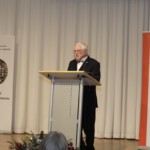 In seiner Laudatio zeichnete Manfred Buer, ehemaliger Vorsitzender des Lintorfer Heimatvereins und selbst Plekettenträger, Müskens’ Lebens- und Schaffenweg als „Nachbarskind, Klassenkameraden, Messdiener und langjährigen Freund‟ nach. Er sei allerdings kein waschechter Dumeklemmer, weil 1938 im benachbarten Dorf an der Düssel geboren. Erst ein Jahr später war die Familie nach Ratingen gezogen. Nach Mittlerer Reife, Kaufmanns-Ausbildung bei der Firma Siebeck und Abendgymnasium studierte Müskens Theologie und Germanistik. 1971 zählte er zur ersten Lehrergeneration des damals neu gebauten Kopernikus-Gymnasium in Lintorf, dem er bis zur Pensionierung treu geblieben war. Buer erinnerte an gemeinsame Zeiten im Messdiener-Zeltlager und an Gruppenabende am Blauen See, „wo wir von Tümmersteinen den Zement abgeklopft haben, um damit das katholische Jugendheim aufzubauen.‟