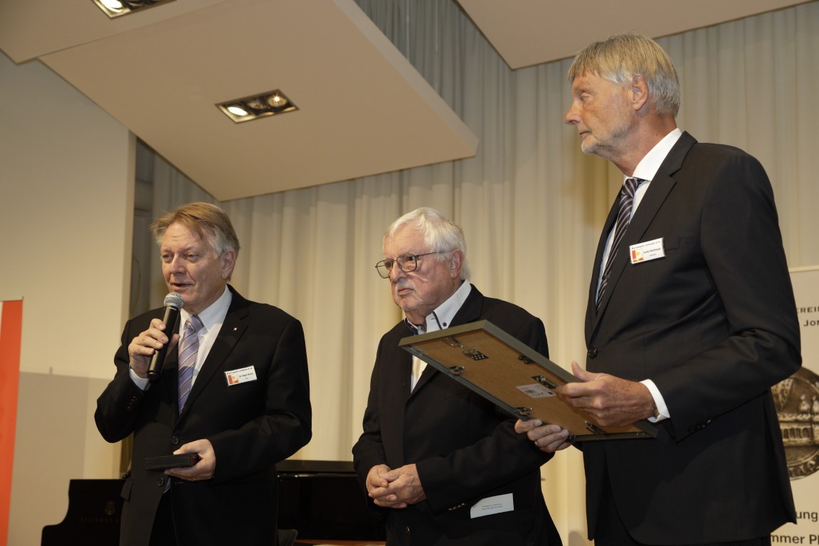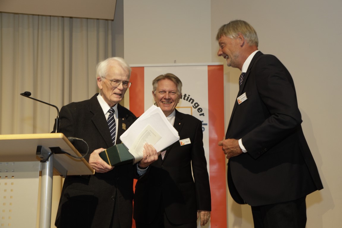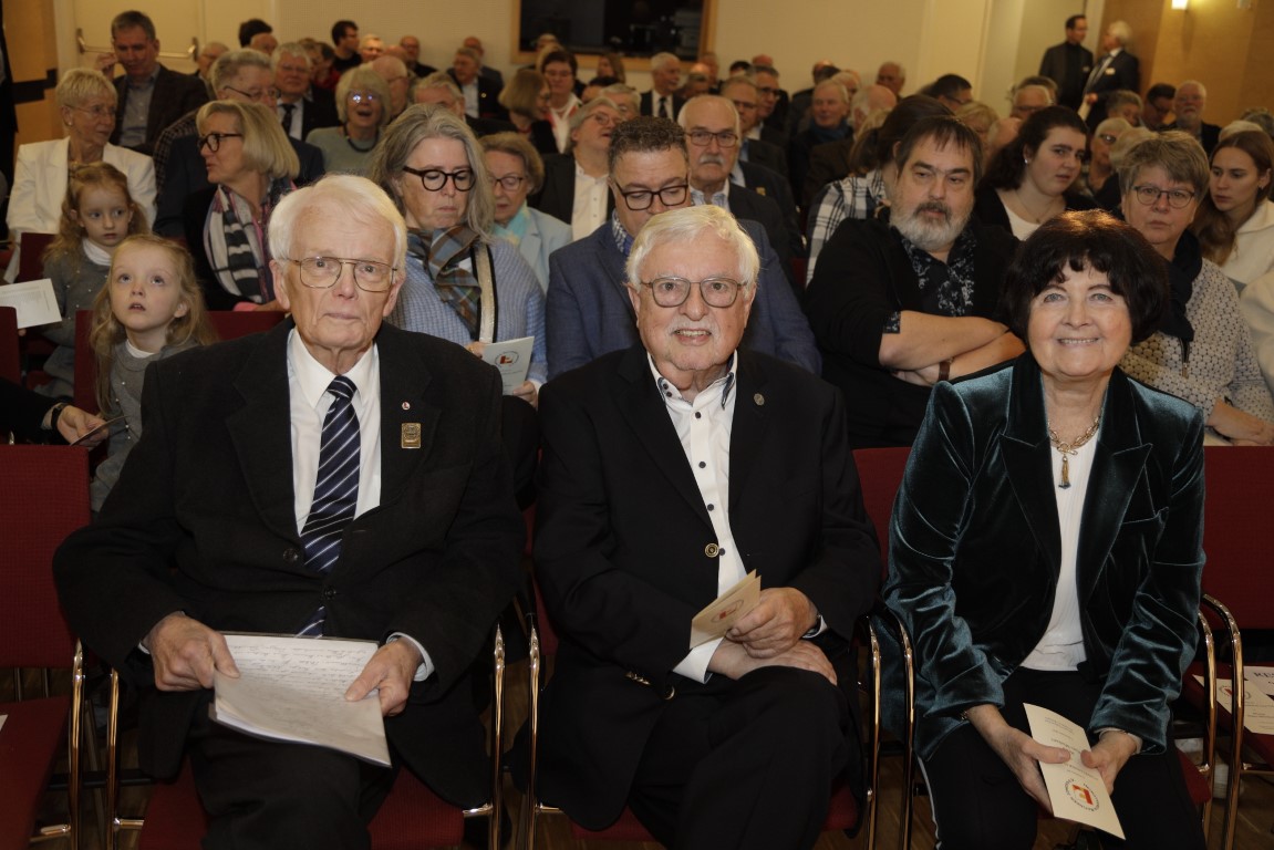 Großer Bahnhof für Hans Müskens: Der bekannte Heimatforscher und Kirchenhistoriker ist für seine Verdienste um die Stadt und Bürgerschaft von den Ratinger Jonges mit ihrer höchsten Auszeichnung, der Dumeklemmer-Plakette, geehrt worden. Zur Feierstunde im gut gefüllten Ferdinand-Trimborn-Saal waren neben dem Familien- und Freundeskreis zahlreiche Vertreter aus Politik, Wirtschaft, Brauchtum und öffentlichem Leben, aber auch viele ehemalige Plakettenträger gekommen. In seiner Begrüßung würdigte Baas Dr. Edgar Dullni den Preisträger als eine in Ratingen und Umgebung bekannte und respektierte Person, die zu Recht im vergangenen Jahr vom Landschaftsverband Rheinland für sein Engagement in der Erforschung u. a. des Barockdichters Friedrich Spee den Rheinlandtaler verliehen bekam. Müskens gründete 2000 das Spee-Archiv in Kaiserswerth und ist bis heute dort Vorsitzender. Für die vom Verein der Lintorfer Heimatfreunde herausgebrachte Jahreszeitschrift „Die Quecke‟ verfasste er bislang mehr als 100 profunde Artikel zur Geschichte Ratingens und Lintorfs. Die Jonges würdigen mit der Ehrung „seine Forschung zum Barockdichter Friedrich Spee sowie seine Verdienste, die historischen Schätze der Stadt Ratingen, besonders der Kirche St. Peter und Paul, zu erforschen, archivieren und den Bürgern nahezubringen‟, wie es auf der Urkunde heißt. „Die Plakette hat nur auf Hans Müskens gewartet‟, fügte Dullni augenzwinkernd hinzu 0und verwies dabei auf das Motiv der Medaille: das Stadtsiegel von 1338 mit dem Bild von St. Peter und Paul.