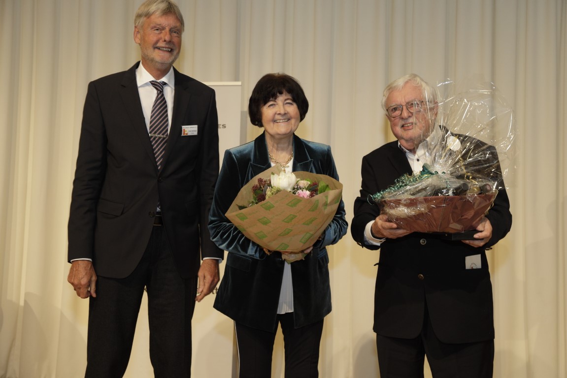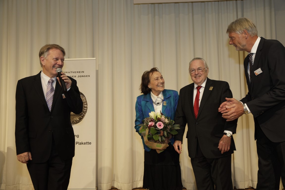 Sichtlich bewegt dankte Müskens für die Ehrung, verwarf sein Redekonzept und plauderte: Die Plakette sei nicht nur Auszeichnung, sondern ja auch Dokument der Baugeschichte. Denn das alte Siegel zeige, dass St. Peter und Paul früher eine romanische Kirche war. „Das ist wie eine Reliquie für mich‟, sagte er schmunzelnd. Mit den Jonges verbinde ihn noch eine Besonderheit: Vor etwa 60 Jahren habe es bei Georg Hoberg, dem heutigen Ehrenbaas, eine Fete gegeben, bei der er ein nettes Mädchen kennengelernt und fünf Jahre danach geheiratet habe – seine Ehefrau Eva…