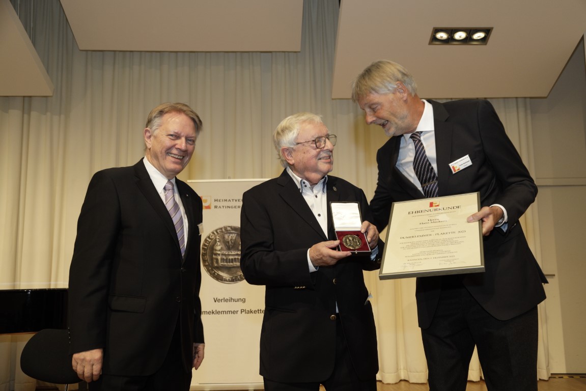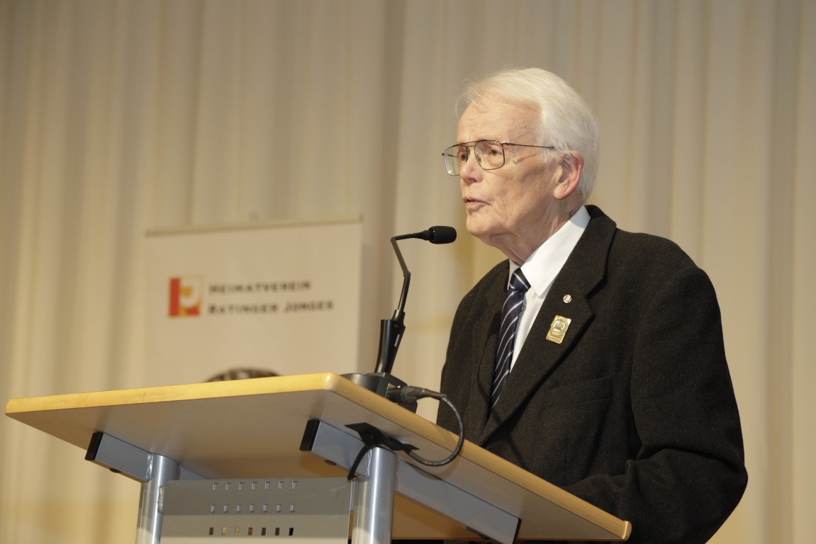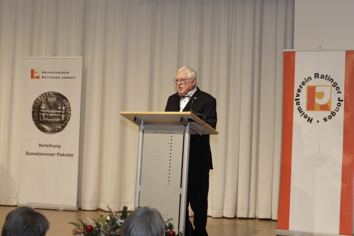 In seiner Laudatio zeichnete Manfred Buer, ehemaliger Vorsitzender des Lintorfer Heimatvereins und selbst Plekettenträger, Müskens’ Lebens- und Schaffenweg als „Nachbarskind, Klassenkameraden, Messdiener und langjährigen Freund‟ nach. Er sei allerdings kein waschechter Dumeklemmer, weil 1938 im benachbarten Dorf an der Düssel geboren. Erst ein Jahr später war die Familie nach Ratingen gezogen. Nach Mittlerer Reife, Kaufmanns-Ausbildung bei der Firma Siebeck und Abendgymnasium studierte Müskens Theologie und Germanistik. 1971 zählte er zur ersten Lehrergeneration des damals neu gebauten Kopernikus-Gymnasium in Lintorf, dem er bis zur Pensionierung treu geblieben war. Buer erinnerte an gemeinsame Zeiten im Messdiener-Zeltlager und an Gruppenabende am Blauen See, „wo wir von Tümmersteinen den Zement abgeklopft haben, um damit das katholische Jugendheim aufzubauen.‟