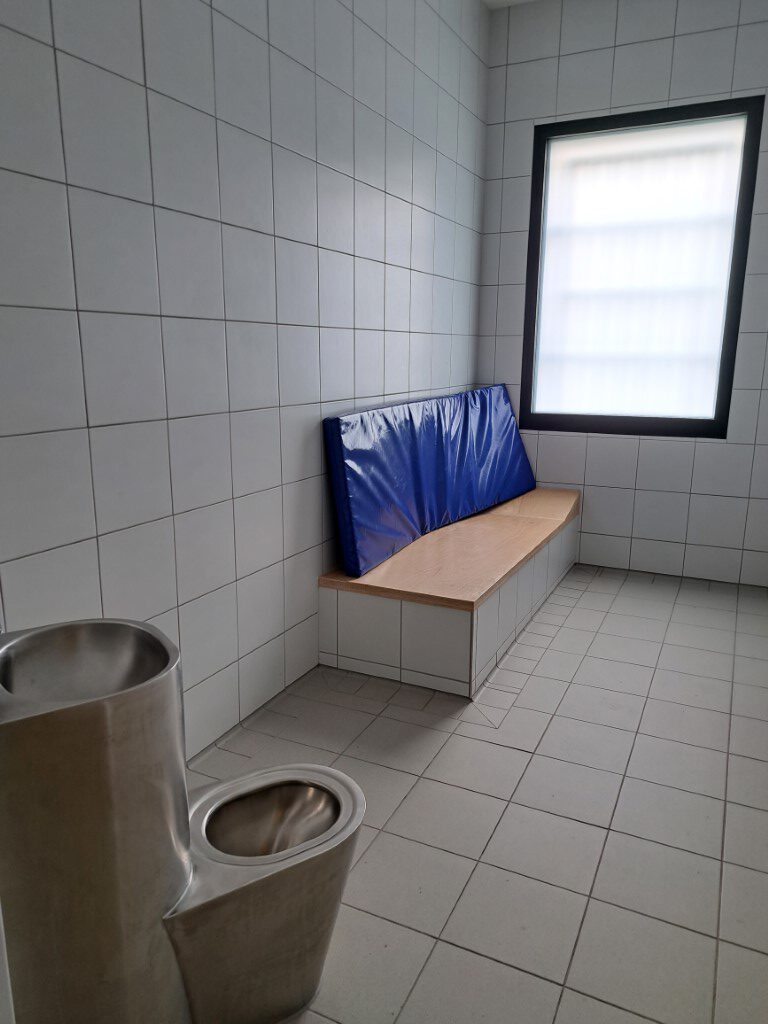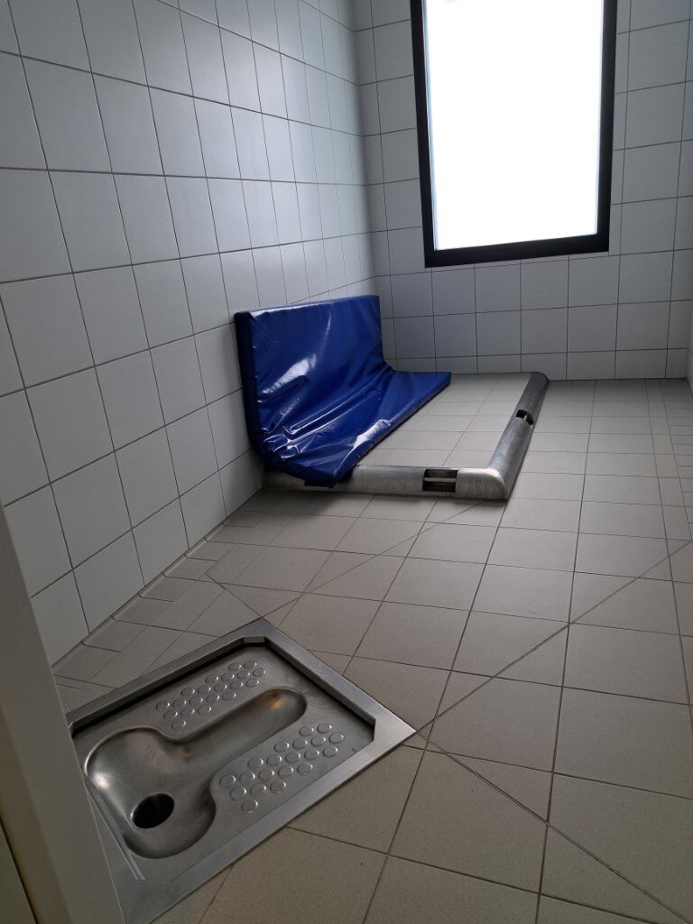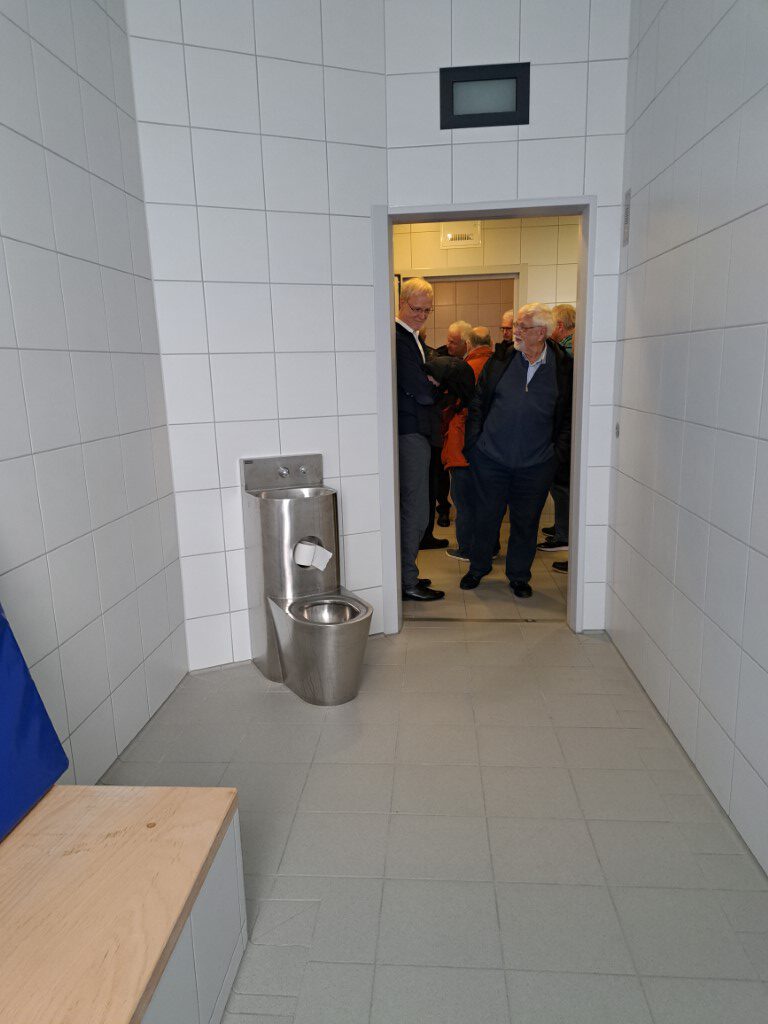 Dann ging es auch sogleich in den Knast, der hier aus dem separat gesicherten Zugang und drei Einzelzellen besteht, wobei eine Zelle einem eventuellen Randalierer vorbehalten ist, der dort zum Schutz aller – einschließlich seiner selbst - auch angekettet werden kann.