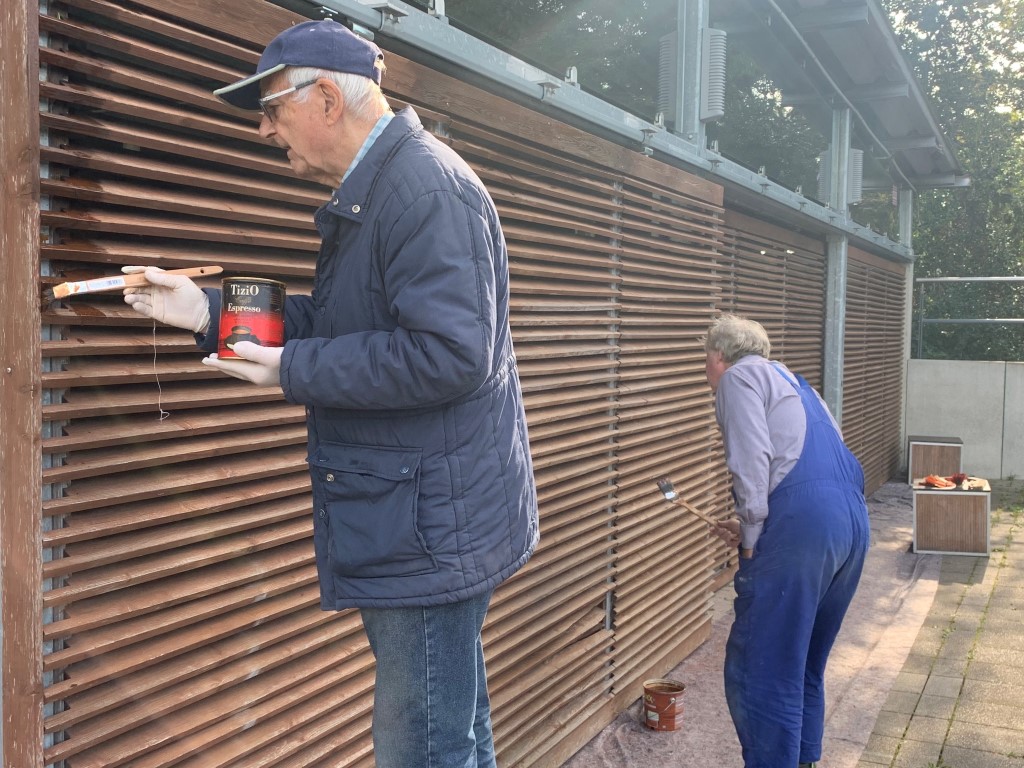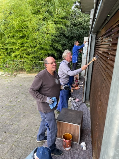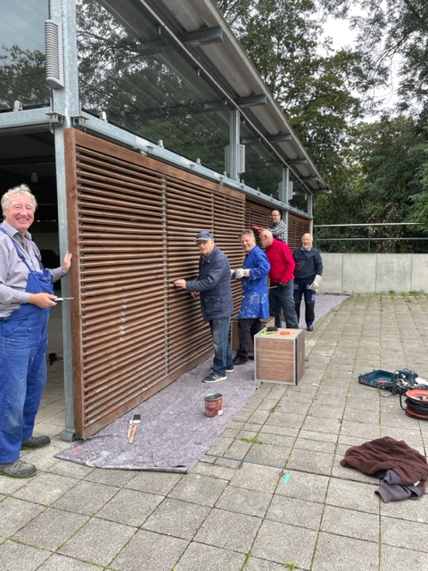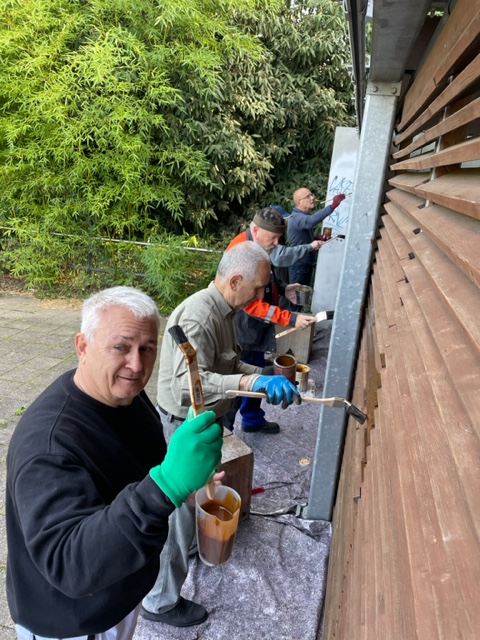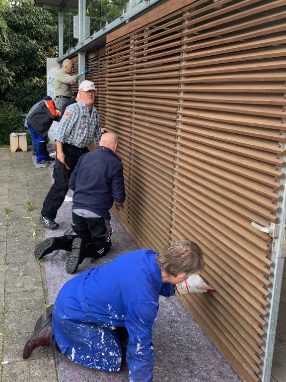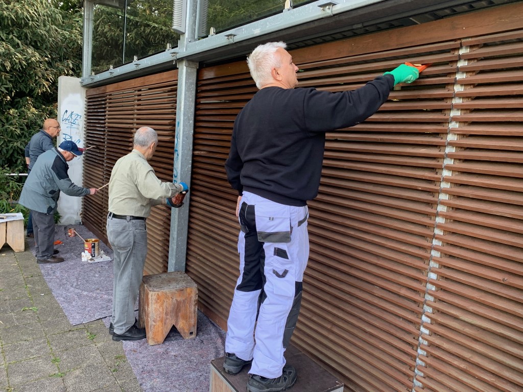 Ein Malermeister aus den Reihen der Jonges hatte im Vorfeld den Pavillon begutachtet, eine entsprechende Materialliste erstellt und die Vorgehensweise erklärt. Von Hand wurden dann zig Quadratmeter Holz geschmirgelt und geschliffen, entsaubt und gestrichen. Fast 14 Liter hochwertige Lasur, 13 kleine und große Pinsel, 20 Meter Malervlies, ein Kasten Minaralwasser und Altbier sowie ein Blech Strudelkuchen wurden innerhalb von vier Stunden „verarbeitet‟. Das Ergebnis kann sich sehen lassen: Die Lamellen der Pavillonwände sind jetzt nicht nur wieder gegen Wind und Wetter geschützt, sondern strahlen wie neu in einem satten Holzton.