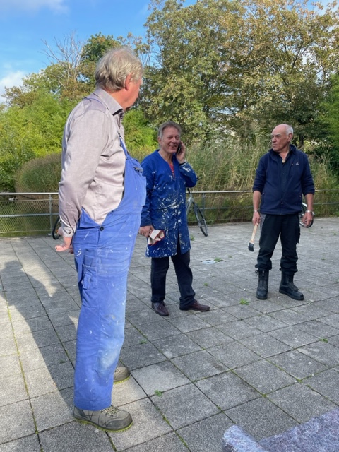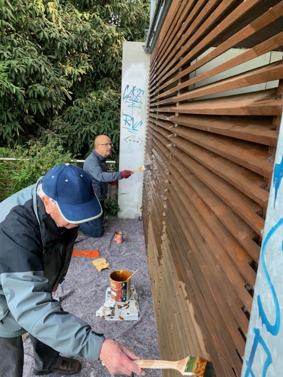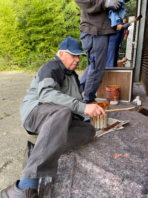 Nach einer Anfrage bei der Stadt gab es überraschend schnell grünes Licht für die Aktion, so dass am Wochenende die Gunst des schönen Wetters genutzt wurde: Nach einem kurzen Mailaufruf hatten sich 14 Jonges zum Schleifen und Streichen eingefunden, darunter auch Clemens Michel, der mit fast 89 Jahren der älteste Helfer war. Hier mitzumachen war für ihn natürlich Ehrensache, schließlich gehe es doch um „unsere schöne Heimatstadt‟. Dafür ließ er sogar das Mittagessen zu Hause ausfallen. Auch der bekannte Ratinger Künstler Yildirim Denizli tauschte sein Atelier gegen die Freiluft-Streichaktion und pinselte geduldig die verwitterten Holzlamellen.