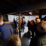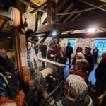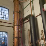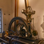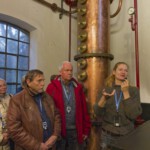 Der Rundgang startete bei den beiden Dampfkesseln, die unter anderem den Dampf für die im Nebenraum stehende Dampfmaschine lieferte, mit deren Hilfe die Transmissionsanlage für Sackaufzug, Kornreinigungsanlage, Schrotmühle, Rührwerk im Maischbottich und Süßmaischpumpe betrieben werden konnten. Über steile Treppen ging es weiter durchs Haus, wobei uns der Produktionsprozess der Alkoholherstellung auch dank der extra eingeschalteten Maschinen gut nachvollziehbar erklärt wurde.