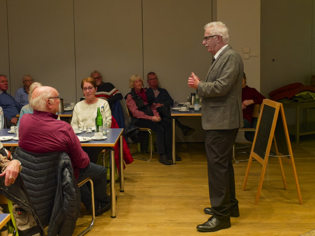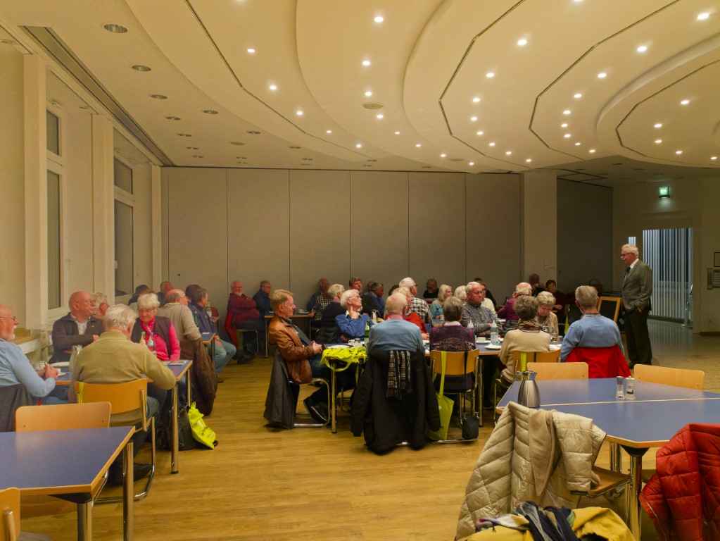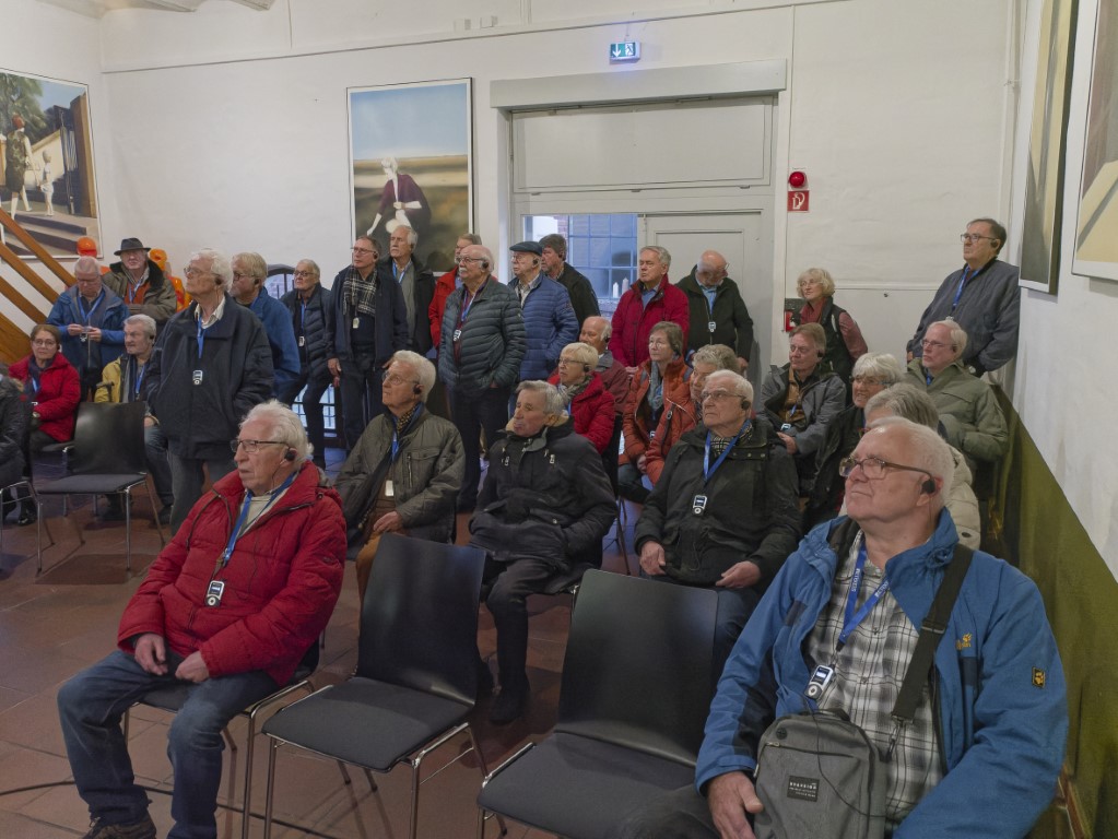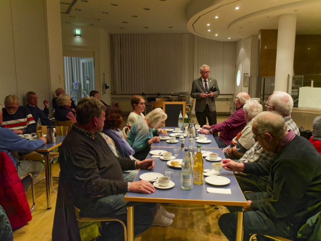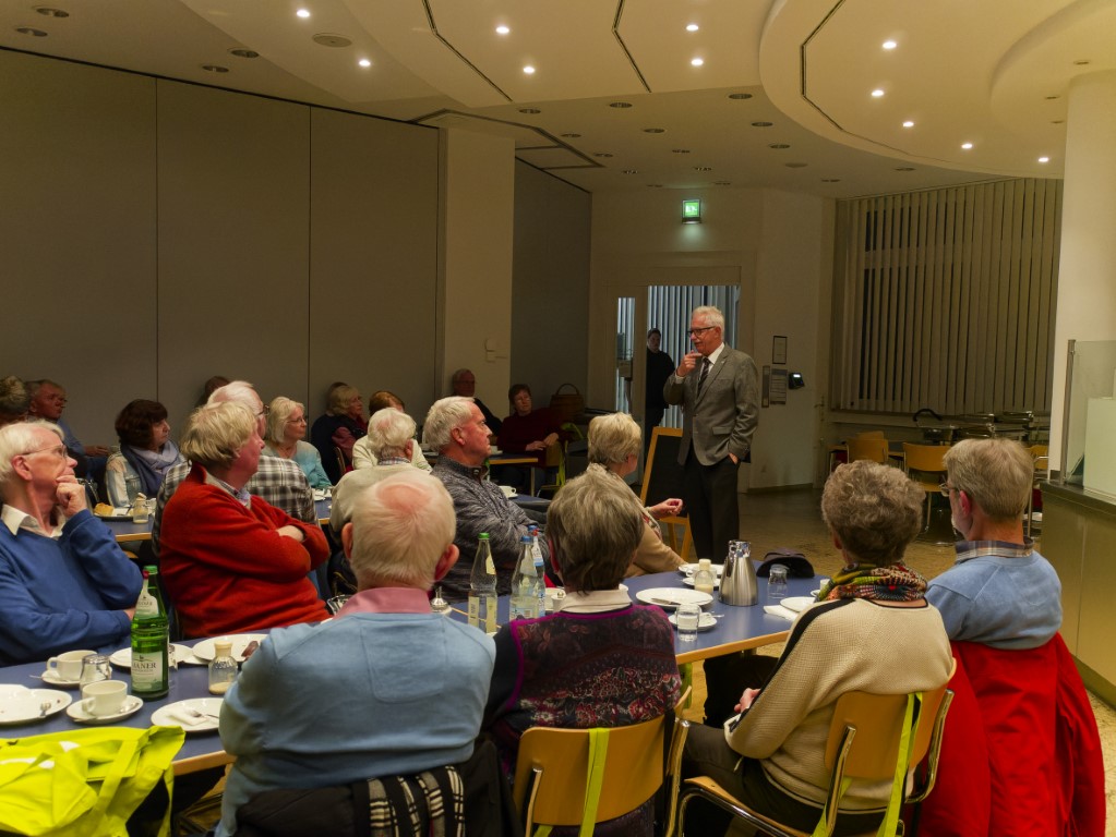 Bei Kaffee und Kuchen begrüßte uns Landrat Thomas Hendele und erläuterte die Geschichte der Entstehung des Kreises, die wohl den meisten Anwesenden so kaum bekannt war, da dessen Ursprung bereits auf das Jahr 1816 zurückgeht, aber dann anschließend mehrfach neu gegliedert und umbenannt wurde. Vermutlich konnten sich aber alle an das Jahr 1975 erinnern, als der Kreis Mettmann schließlich den heutigen Namen erhielt, Ratingen vom Kreis Düsseldorf nach Mettmann eingegliedert wurde und damit auch das Autokennzeichen „ME“ erhielt.