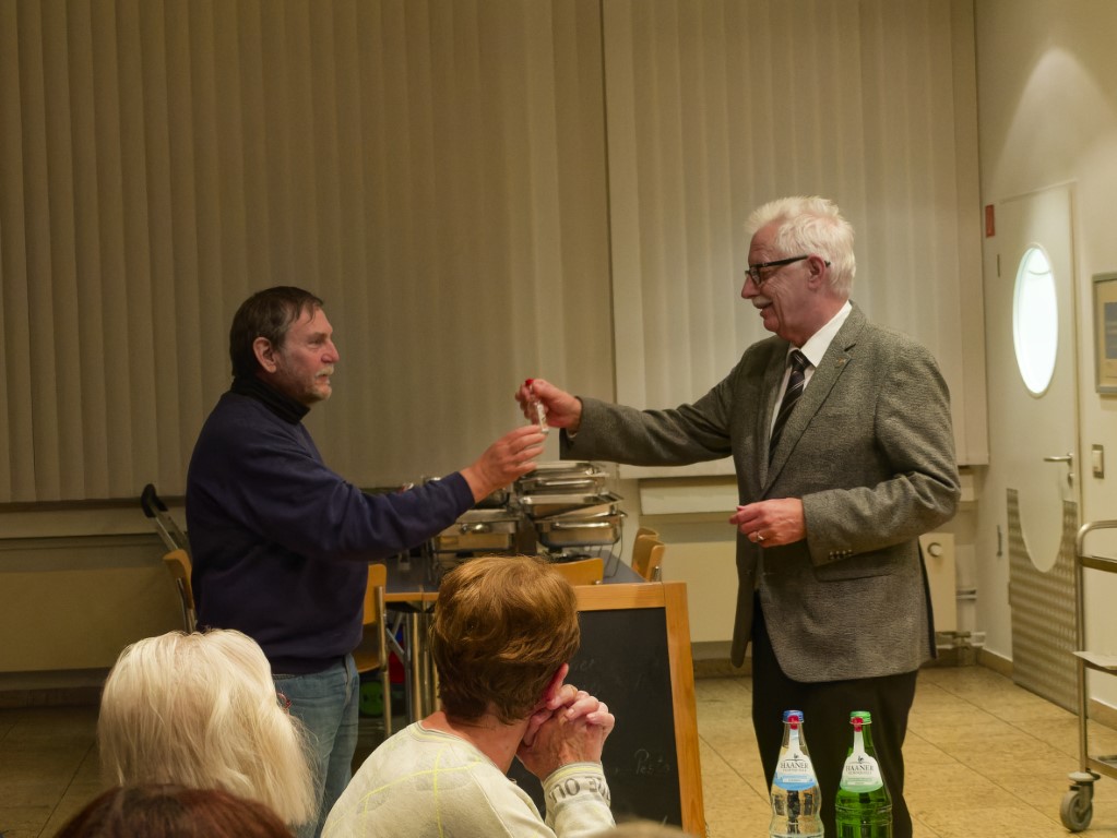 Anschließend erklärte Herr Hendele noch die Arbeit der Kreisverwaltung und auch seine Tätigkeit als Landrat, bevor er die diversen Fragen der Jonges beantwortete und zum Schluss kräftigen Applaus aller Teilnehmer dafür erhielt. Zum Dank für die Einladung und für den Vortrag erhielt Herr Hendele vom Reisebaas auch noch ein Fläschchen „Alter Hildener“ Korn, den er gerne annahm, da er selber aus Hilden stammt.