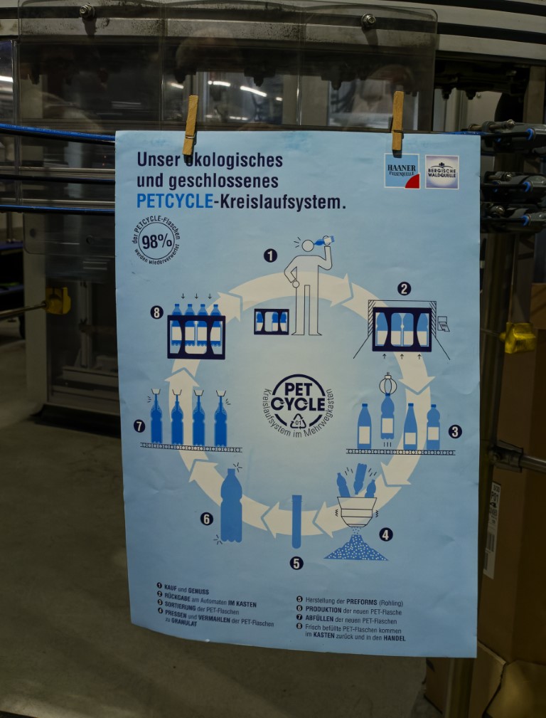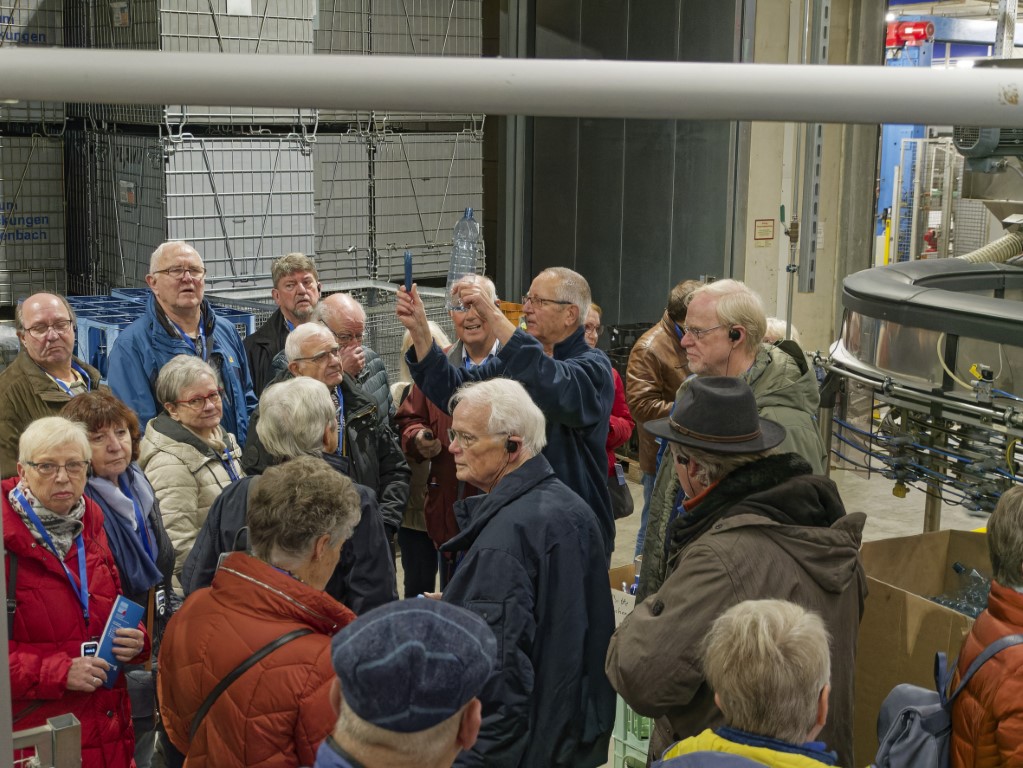 Anschließend ging es weiter in die Produktionshalle, in der alle Teilnehmer staunend zuerst die Herstellung der PET-Flaschen beobachten können, die in rasanter Geschwindigkeit aus einem angelieferten Vorformling nach der Erwärmung zur endgültigen Größe aufgeblasen werden (Blasformverfahren), um anschließend über Hängeschienen zur Abfüllanlage weiter gefördert zu werden, wo wir den weiteren Prozessablauf beobachten durften. Auch hier läuft alles vollautomatisiert, wobei neben den PET-Flaschen auf separaten Bändern auch Glasflaschen nach dem Reinigen befüllt, verschlossen und etikettiert werden.