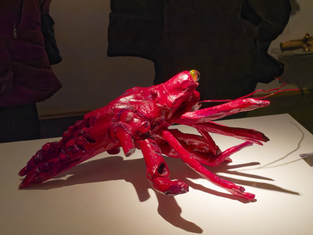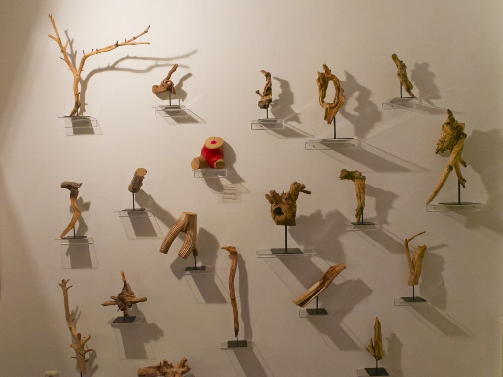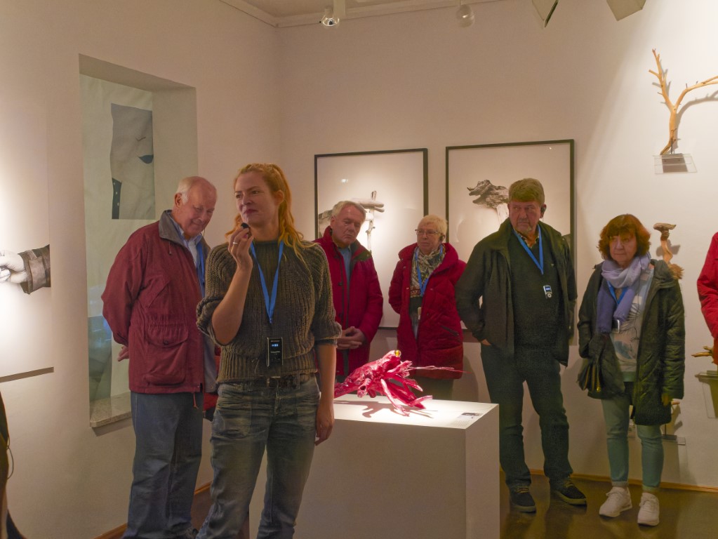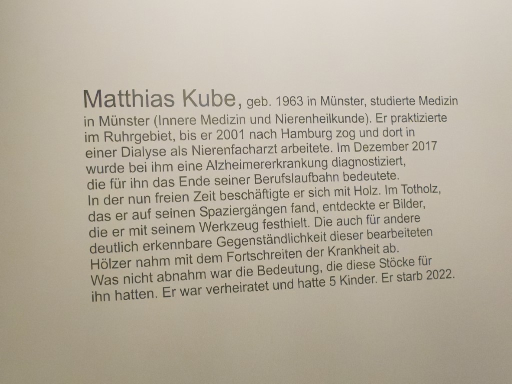 Diese startete dann sogleich in der Ausstellung mit dem Thema „Festgehalten. Kunst als Wegweiser im Dunkel der Psyche“, die sich aus zwei Abschnitten zusammensetzt. Zuerst konnten wir die Holzarbeiten des an Morbus Alzheimer erkrankten und inzwischen verstorbenen Arztes Matthias Kube bestaunen, die weitestgehend aus bei Spaziergängen gefundenen und dann teilweise bearbeiteten Wurzeln bestehen, wogegen der zweite Teil sich mit dem Medium Fotografie des ehemaligen drogenabhängigen Tino Zimmermann beschäftigt, der es damit schaffte, sich aus seiner Sucht und einer psychischen Erkrankung zu befreien.