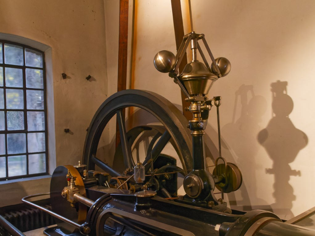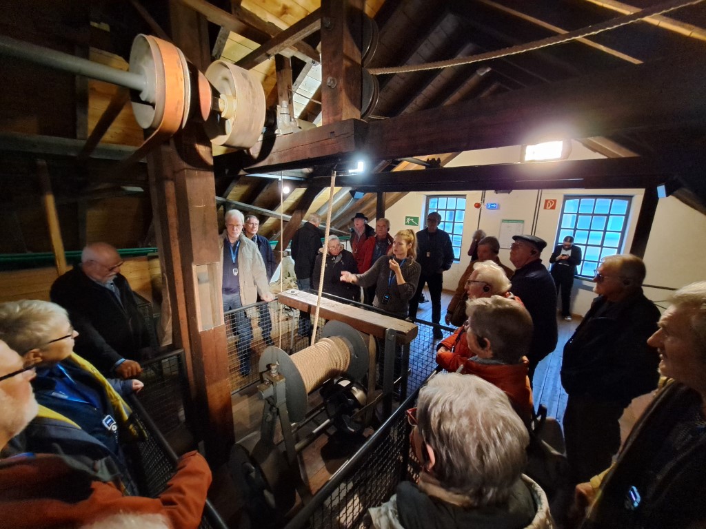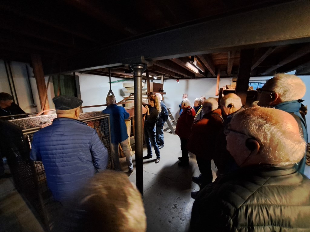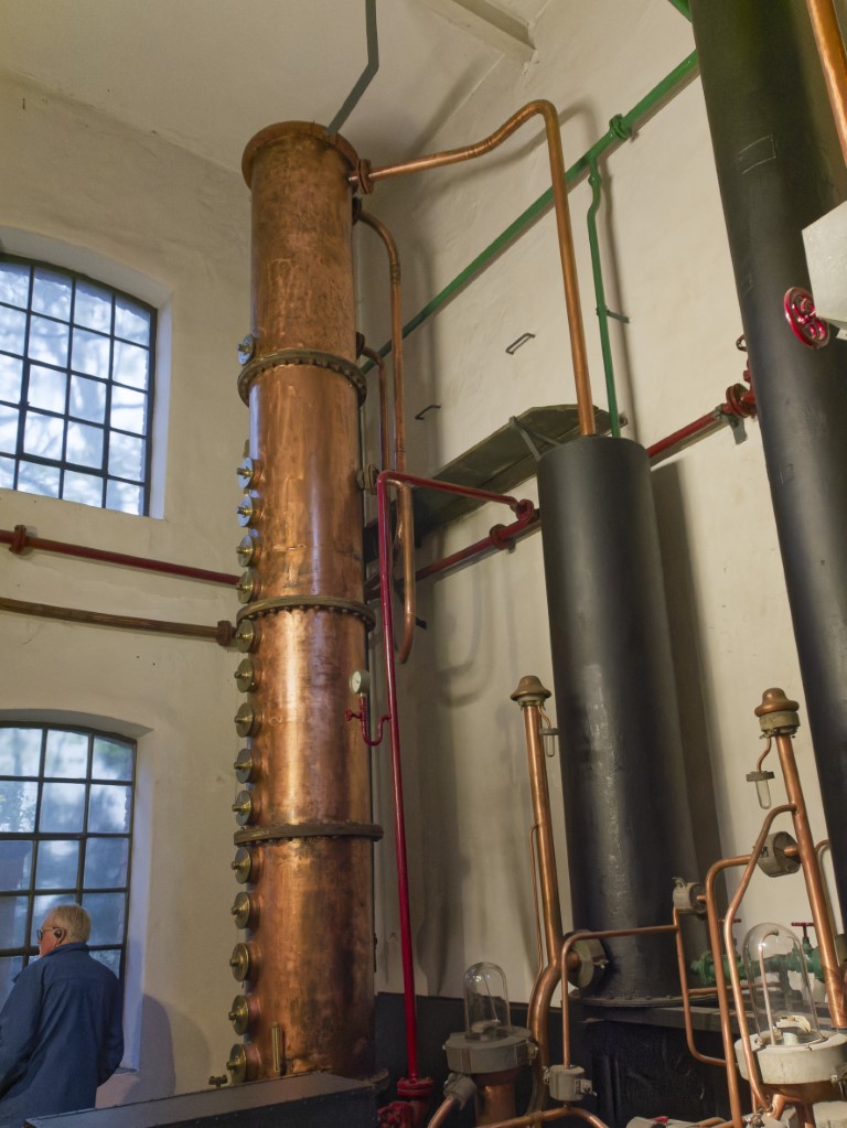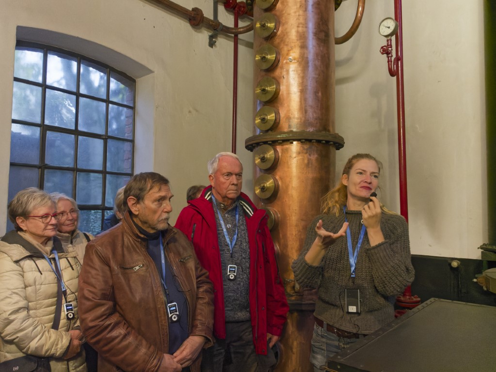 Der Rundgang startete bei den beiden Dampfkesseln, die unter anderem den Dampf für die im Nebenraum stehende Dampfmaschine lieferte, mit deren Hilfe die Transmissionsanlage für Sackaufzug, Kornreinigungsanlage, Schrotmühle, Rührwerk im Maischbottich und Süßmaischpumpe betrieben werden konnten. Über steile Treppen ging es weiter durchs Haus, wobei uns der Produktionsprozess der Alkoholherstellung auch dank der extra eingeschalteten Maschinen gut nachvollziehbar erklärt wurde.