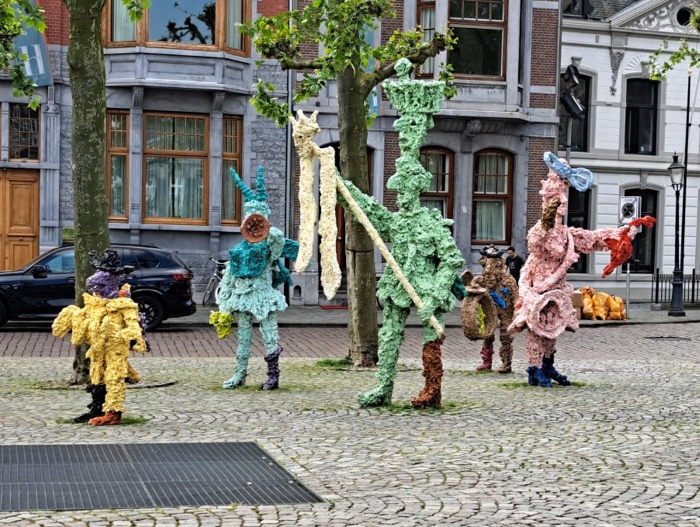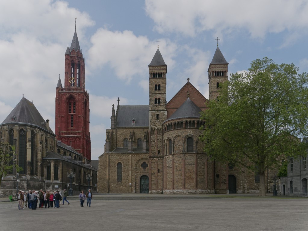 - Der Vrijthof mit der Sankt-Servatius-Basilika (mit dem Grab des in Maastricht verstorbenen hl. Servatius aus dem 4. Jhd.), die benachbarte protestantische Sankt-Johannis-Kirche, und der aus Bronze bestehenden bunten Skulpturengruppe 'T Zaat Herremenieke.