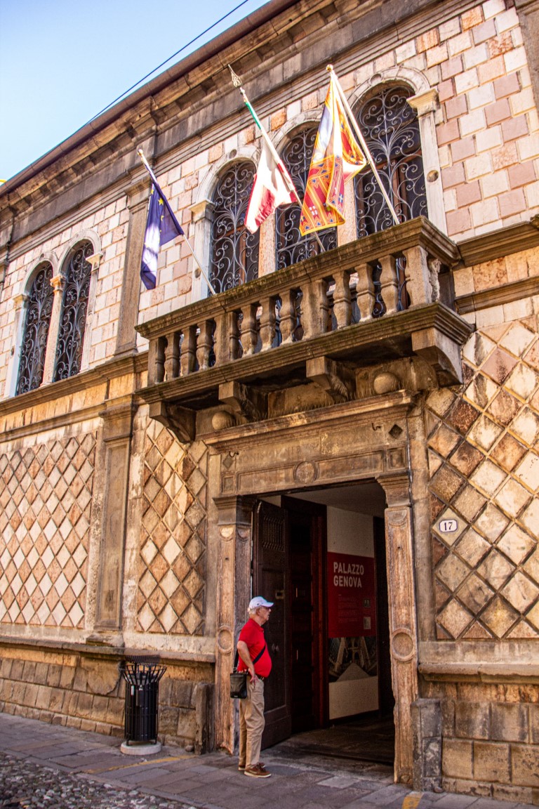 Nach einem kurzen Besuch in der Ruine des „Castello degli Ezzelini“ führte uns unsere Fremdenführerin zum „Belvedere di Piazza Terraglio“, einem Aussichtspunkt oberhalb der „Brenta“. Von dort aus hat man einen herrlichen Ausblick auf die Unterstadt am anderen Flussufer. Hinüber führt eine alte, rostbraune Holzbrücke, die das Wahrzeichen von Bassano ist und „Ponte Vecchio“ (Alte Brücke) genannt wird. Nach einem Rundgang durch die Oberstadt mit engen Gassen und vielen historischen Häusern erreichten wir dann genau diese Brücke und überquerten zusammen mit zahlreichen anderen Touristen die „Brenta“. In diesem Teil von Bassano erinnert vieles an die Schlachten an der „Brenta“ und am „Monte Grappa“ zum Ende des 1. Weltkrieges. Auch die Abschiedsszene eines jungen Paares auf einem kleinen Platz zeugt von dieser schlimmen Zeit. Der fest eingeplante Besuch im Grappa-Museum „Poli“ mit Verkostung entpuppte sich nach einem interessanten Rundgang durch die museale Destillerie als die erwartete Verkaufsveranstaltung für hochprozentige „Reisemitbringsel“.