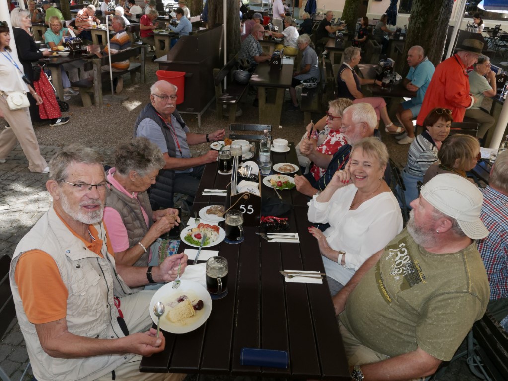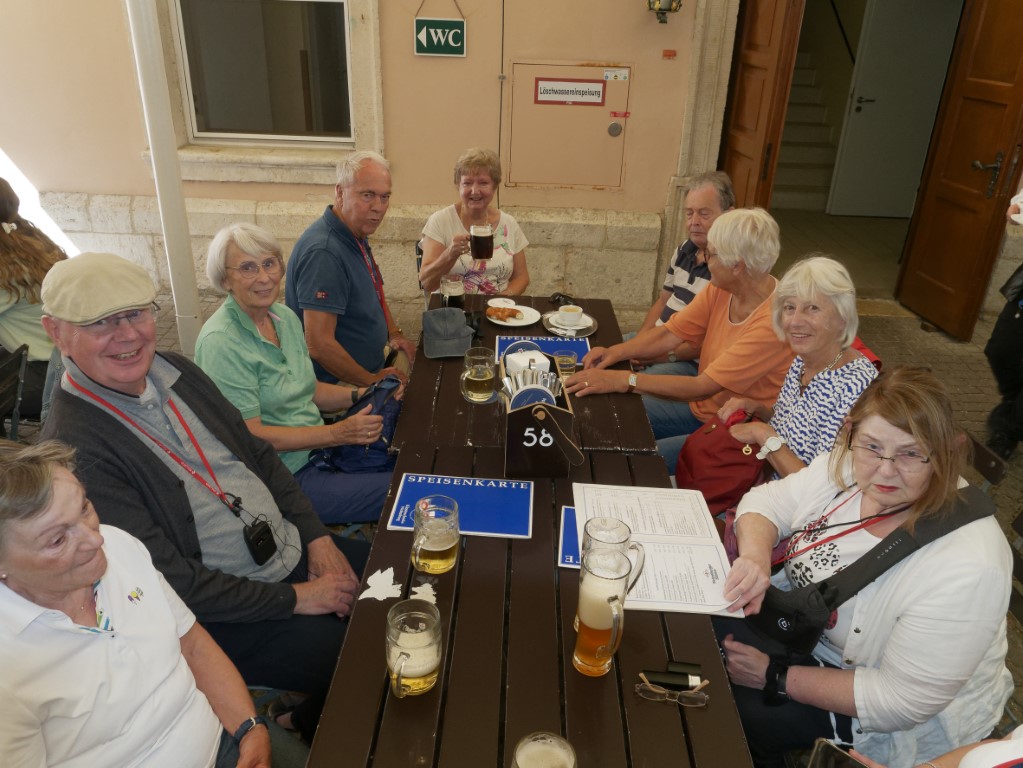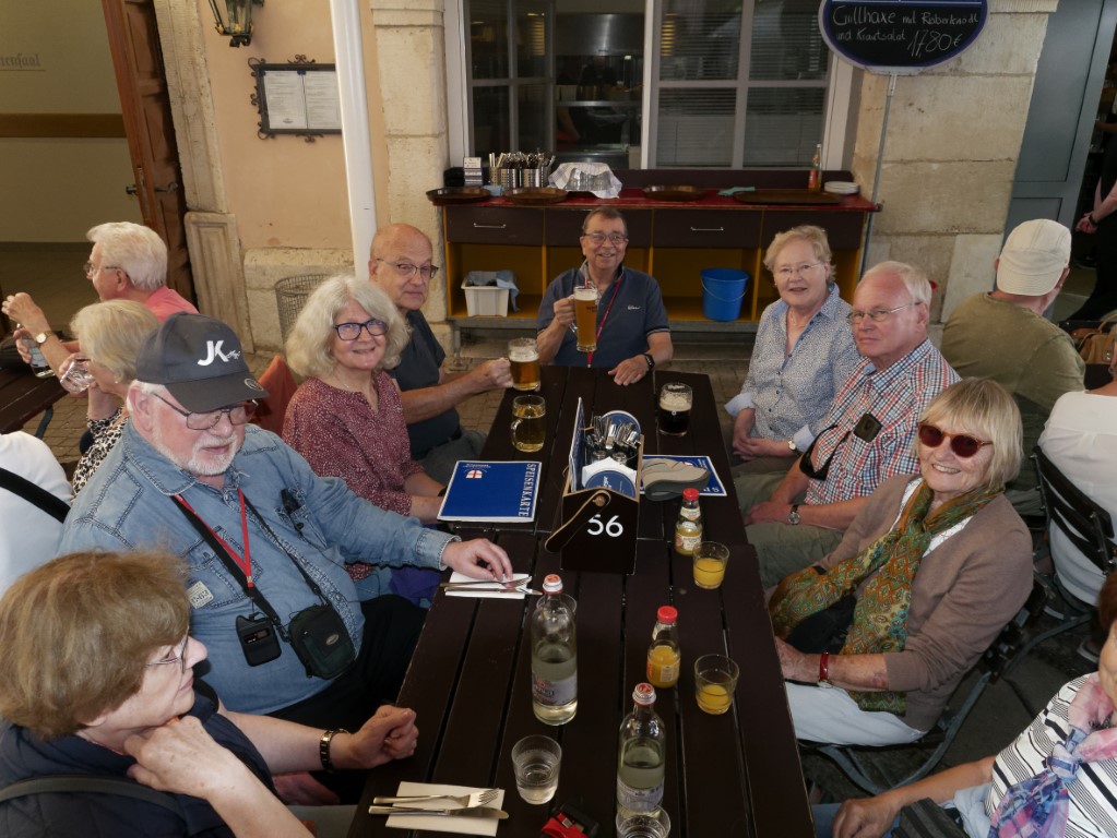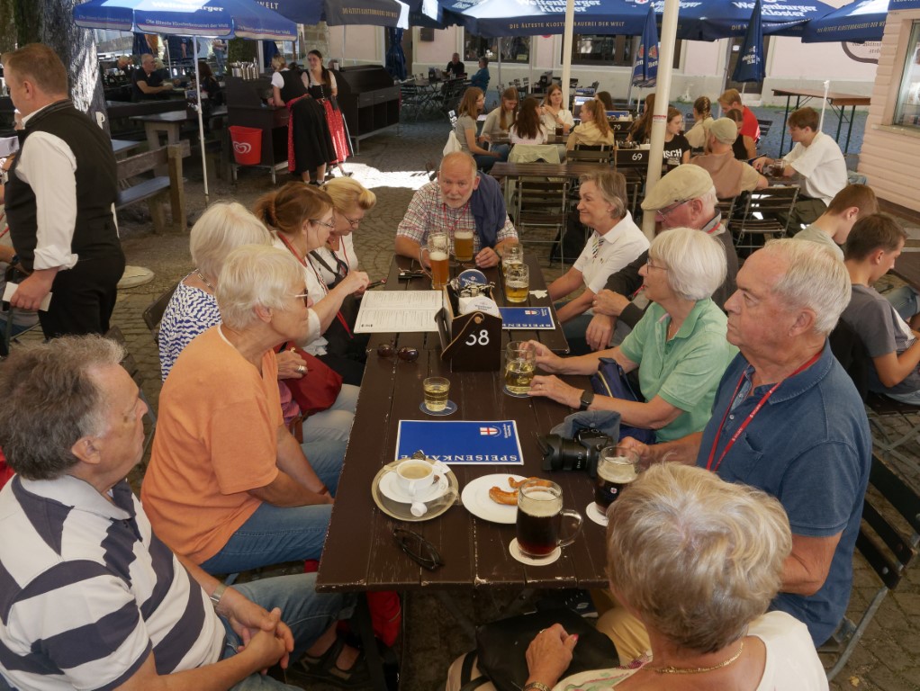 Nach einer reibungslos verlaufenen Fahrt kamen wir recht früh in Regensburg an. Dort waren für uns drei Übernachtungen mitten in der Altstadt im Hotel Münchner Hof gebucht. Weil aber für diesen Tag noch kein Programm vorgesehen war, haben wir die Zeit bis zum Abendessen genutzt und die Umgebung des Hotels auf eigene Faust erkundet. Abends ging es dann zum nahe gelegenen Hacker-Pschorr Wirtshaus, um im Biergarten bei angenehm warmem Wetter typisch bayrische Speisen und so manches Bier zu genießen.