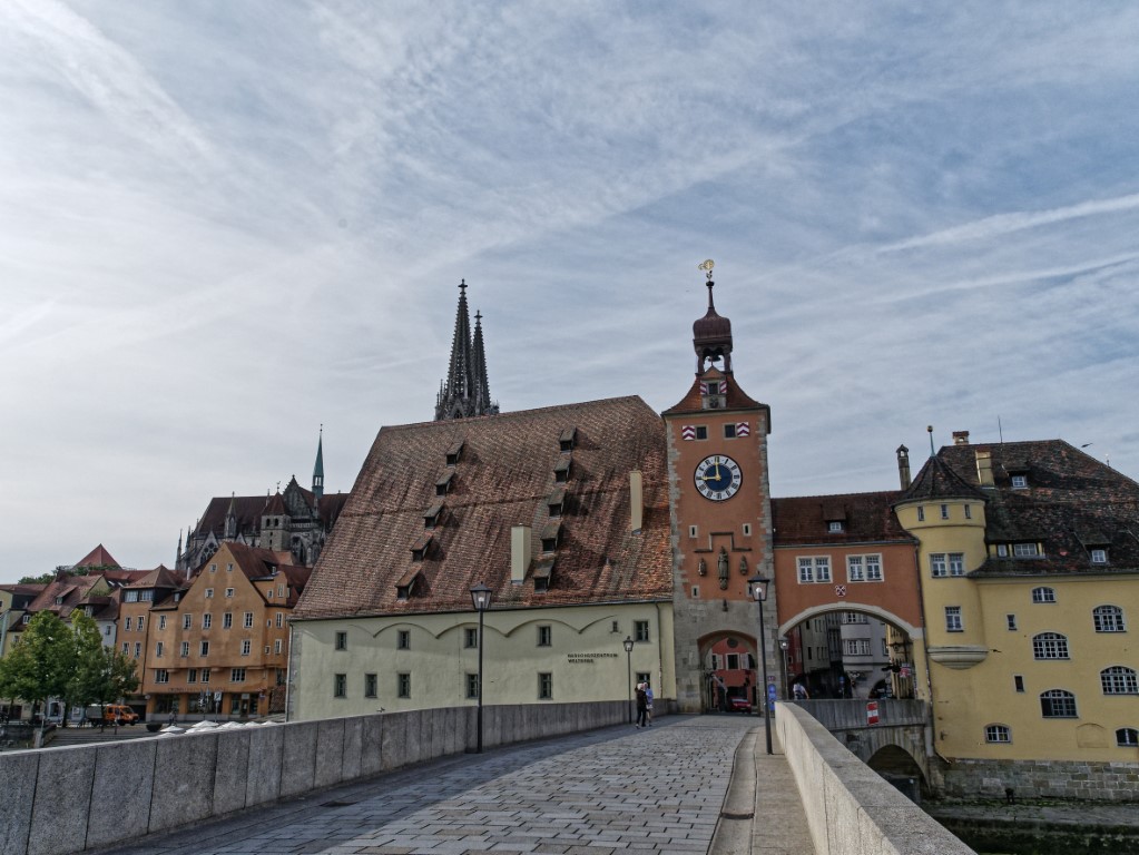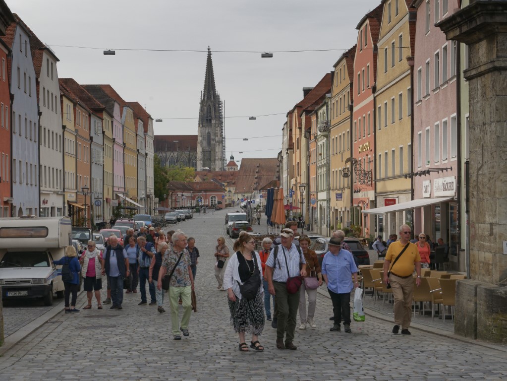 Zurück in Regensburg, startete die Führung durch die Altstadt. Sie begann im Viertel der Krämer und Tändler (Trödler). Der Name Regensburg hat übrigens nichts mit dem Wetter zu tun. Er leitet sich vielmehr vom Fluss Regen ab, der hier in die Donau mündet. Auch das römische Kastell „Castra Regina“ könnte als Namensgeber gedient haben. Neben den beiden Zwillingstürmen des Doms sieht man von der „Steinernen Brücke“ noch weitere Türme. Sie gehören zu alten, städtischen Patrizierburgen und werden deshalb Geschlechtertürme genannt. Die Patrizierfamilien, Stadtadeligen und Kaufleute demonstrierten auf diese Weise ihren Reichtum und ihre Macht. Am Dom St. Peter endete die Führung und die abendliche Freizeit begann. Jeder hatte jetzt wieder die Möglichkeit, Regensburg auf eigene Weise kennen zu lernen.