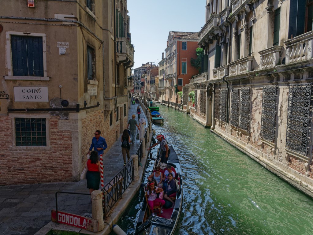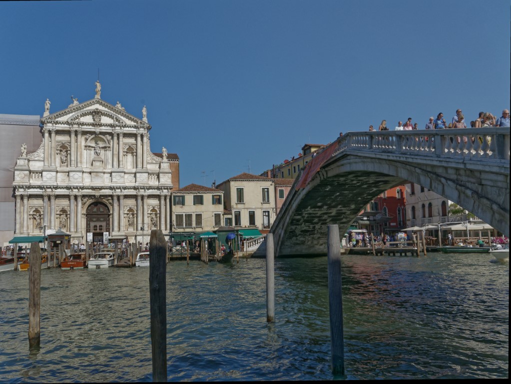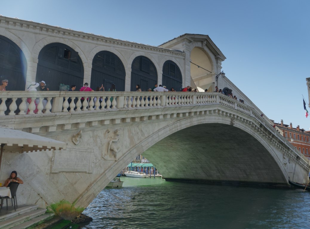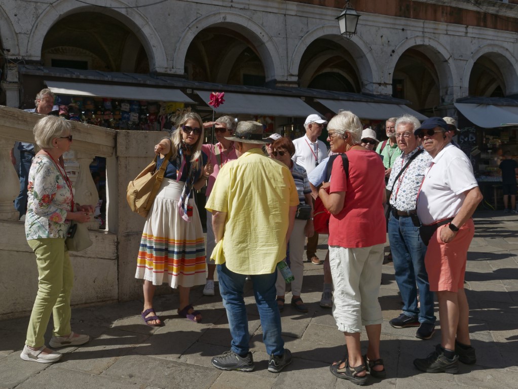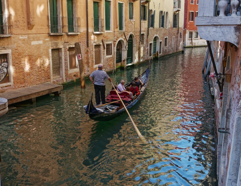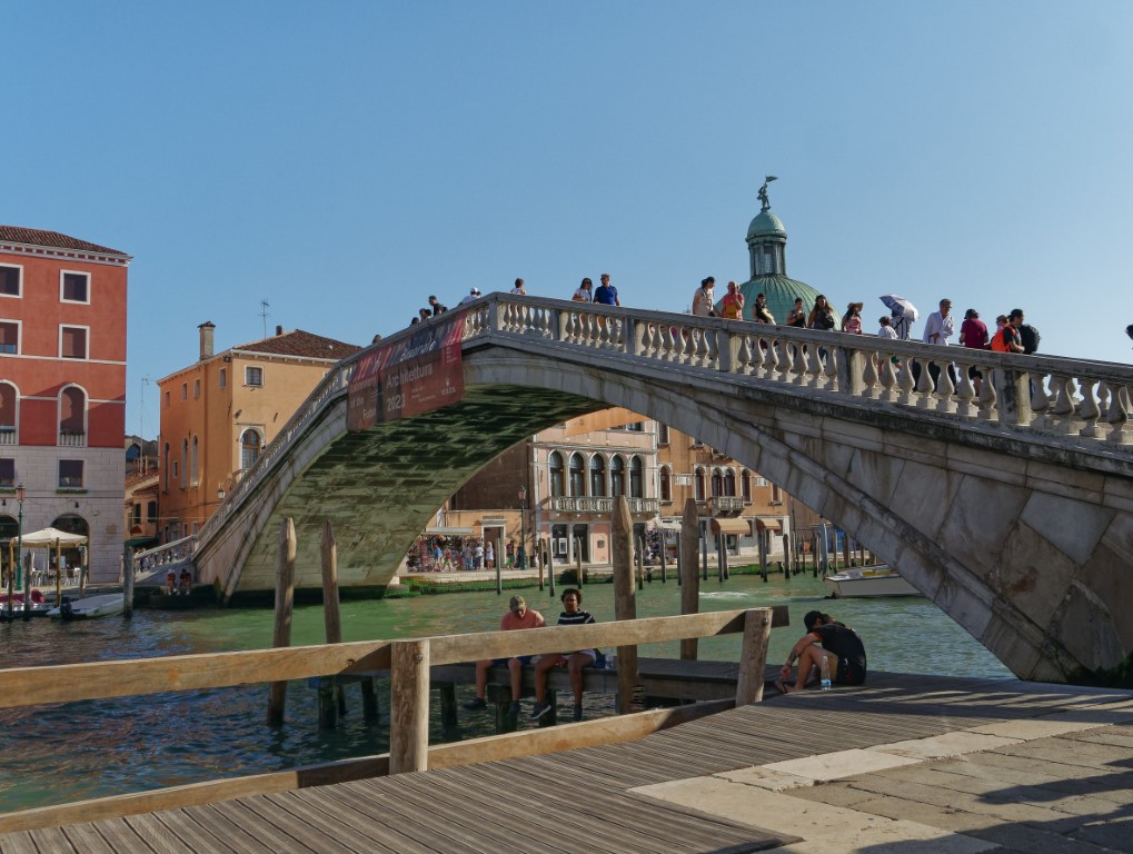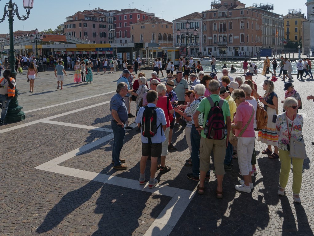 Unser letzter Ausflug ging nach Venedig, der Hauptstadt Venetiens. Wir fuhren mit der Bahn und erreichten pünktlich die „Statione di Venecia Santa Lucia“. Als wir den Bahnhof verließen, standen wir auch schon vor dem „Canal Grande“. Weil es wegen des starken Tourismus‘ unmöglich war, eine große Gruppe von 40 Teilnehmern zu führen, wurden wir in zwei Gruppen aufgeteilt. Unsere beiden Stadtführerinnen erläuterten uns die Verhaltens- und Verkehrsregeln der Inselstadt und brachten uns auf weniger stark frequentierten Wegen immer tiefer ins Zentrum. Ziel war der Markusplatz. Wir überquerten dabei viele Kanäle und gingen über noch mehr Brücken von Insel zu Insel. Gondeln fuhren unter den Brücken durch. Wir sahen kleine Plätze, stolze Palazzi, aus Film und Fernsehen bereits bekannte Orte und viel Unbekanntes. Auf dieser Tour fanden wir auch die Rialtobrücke, die auf 12000 Eichenpfählen errichtet wurde und lange Zeit die einzige Fußgängerbrücke über den „Canal Grande“ war.