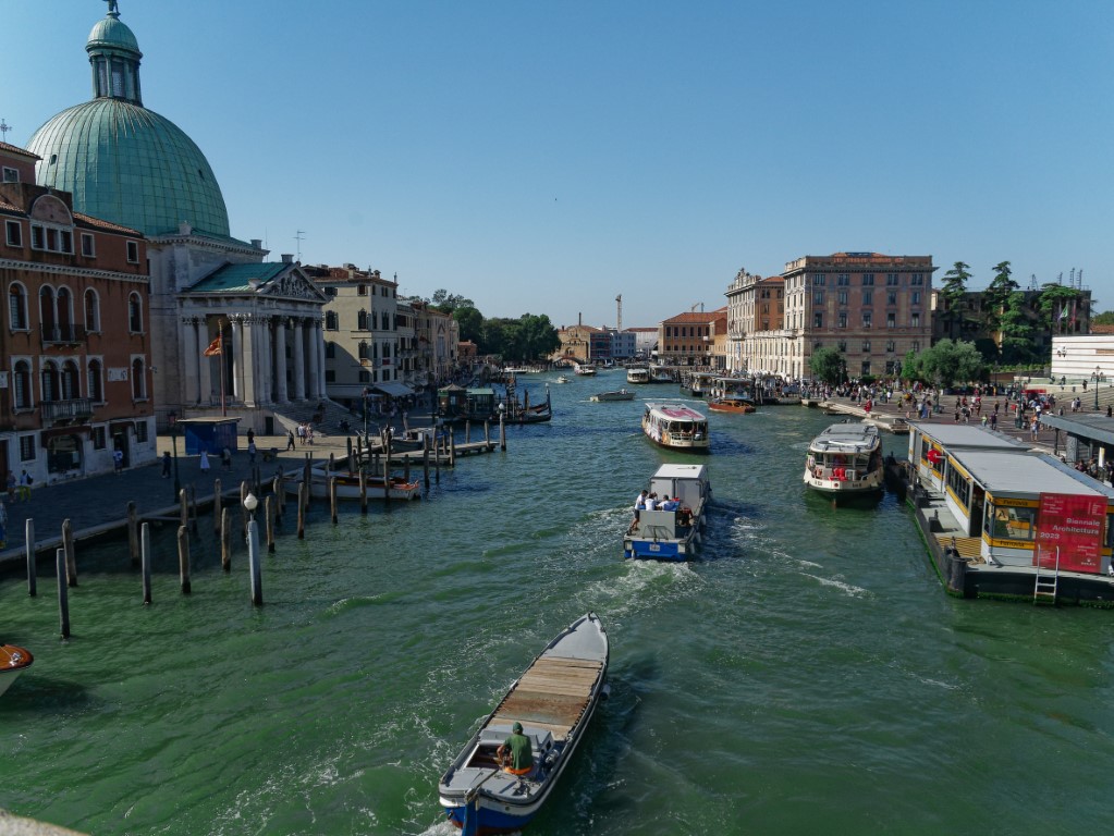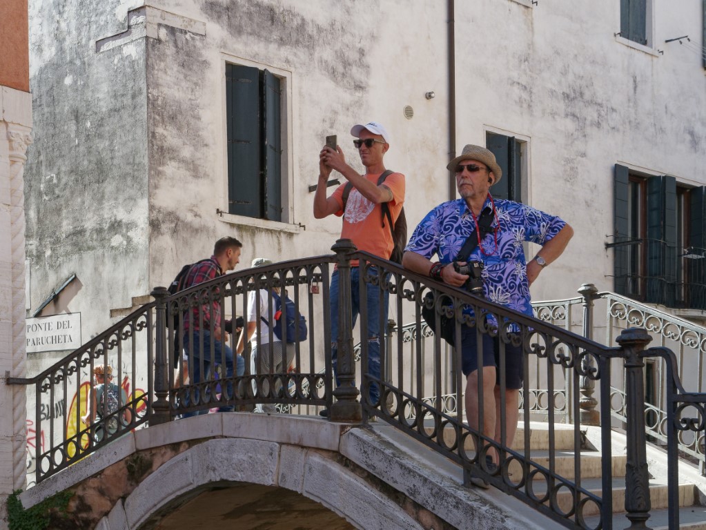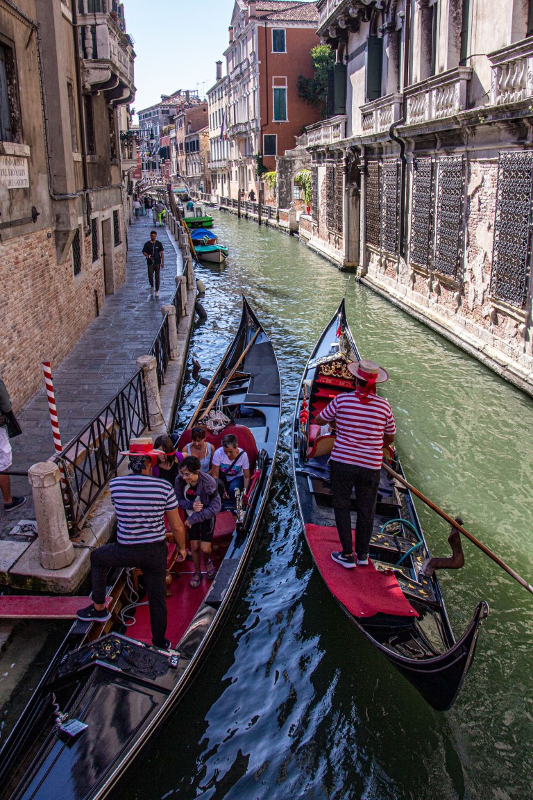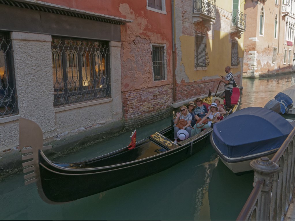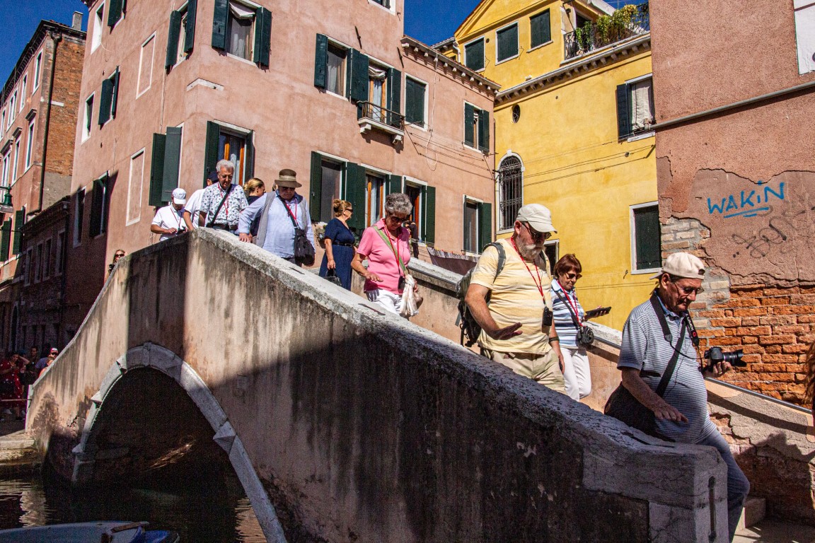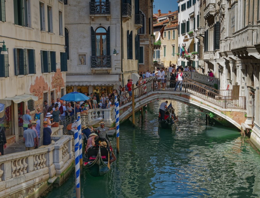 Unser letzter Ausflug ging nach Venedig, der Hauptstadt Venetiens. Wir fuhren mit der Bahn und erreichten pünktlich die „Statione di Venecia Santa Lucia“. Als wir den Bahnhof verließen, standen wir auch schon vor dem „Canal Grande“. Weil es wegen des starken Tourismus‘ unmöglich war, eine große Gruppe von 40 Teilnehmern zu führen, wurden wir in zwei Gruppen aufgeteilt. Unsere beiden Stadtführerinnen erläuterten uns die Verhaltens- und Verkehrsregeln der Inselstadt und brachten uns auf weniger stark frequentierten Wegen immer tiefer ins Zentrum. Ziel war der Markusplatz. Wir überquerten dabei viele Kanäle und gingen über noch mehr Brücken von Insel zu Insel. Gondeln fuhren unter den Brücken durch. Wir sahen kleine Plätze, stolze Palazzi, aus Film und Fernsehen bereits bekannte Orte und viel Unbekanntes. Auf dieser Tour fanden wir auch die Rialtobrücke, die auf 12000 Eichenpfählen errichtet wurde und lange Zeit die einzige Fußgängerbrücke über den „Canal Grande“ war.