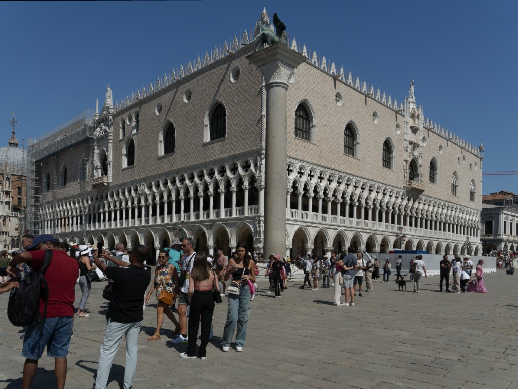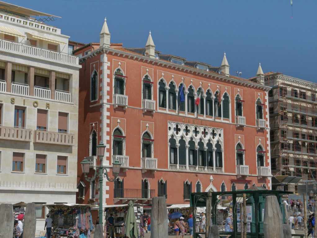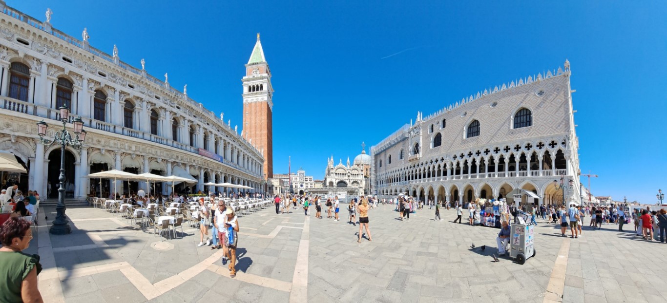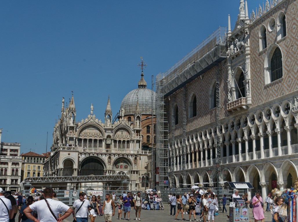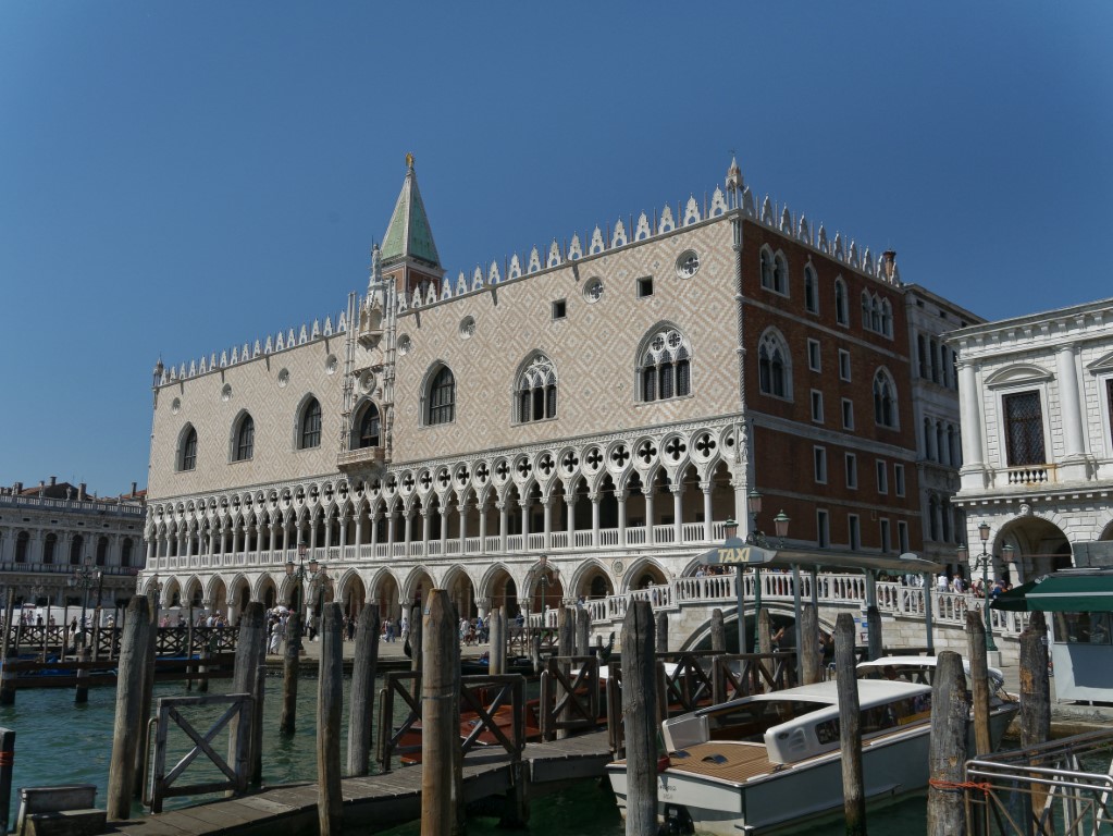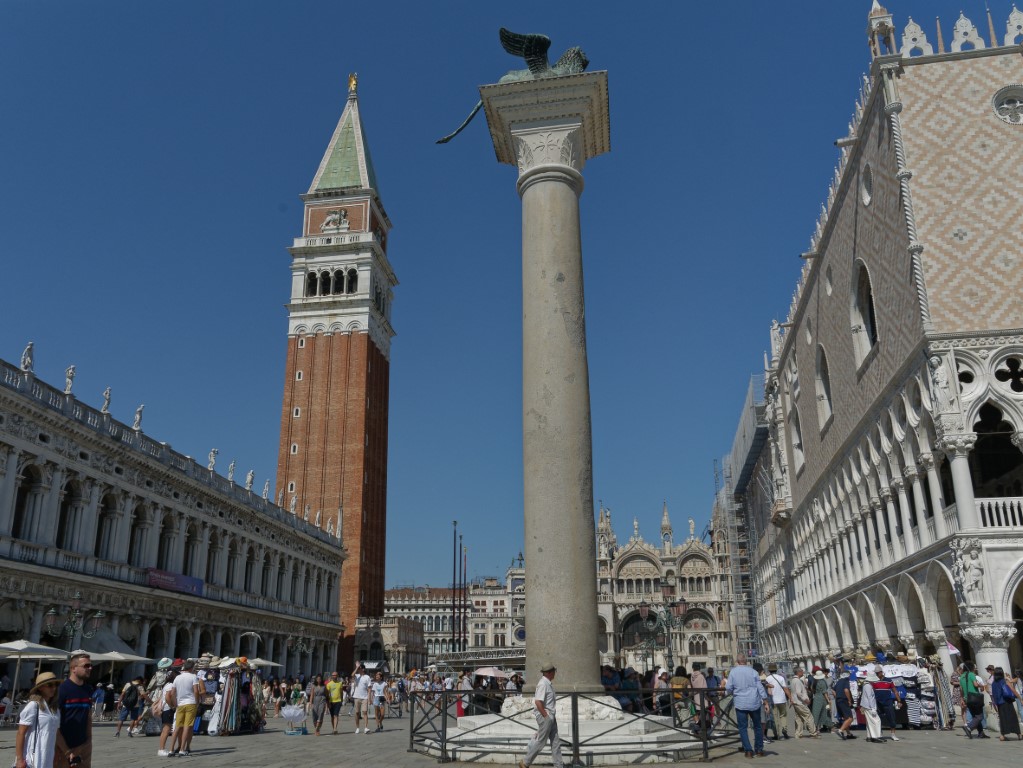 Von dort aus waren es nur noch ein paar Brücken weiter und wir standen am Rande der „Piazza San Marco“. Der Markusdom, der Dogenpalast, der riesige Uhrenturm und der Blick auf die weite Lagune sind schon atemberaubend. Die beiden Gruppen trafen sich hier wieder und die Führung war zu Ende. - Der Markusplatz lädt ein, vor dem Café Florian ein Eis zu essen und das Treiben der Touristen zu verfolgen. Tauben gibt es fast keine mehr, denn die Möwen haben hier die Lufthoheit übernommen. Auf riesige Kreuzfahrtschiffe wartet man auch vergebens und der neue Hafen für diese Schiffe verwaist. Die Vernunft hat gesiegt!