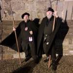 Unsere Nachtwächter Oliver Posberg und Heinz-Werner Blumenkamp empfingen unsere 14-köpfige Gruppe in der damals üblichen Arbeitskleidung (Helm und Umhang; ausgestattet mit Hellebarde, Laterne und Horn) vor der Kirche St. Peter und Paul.