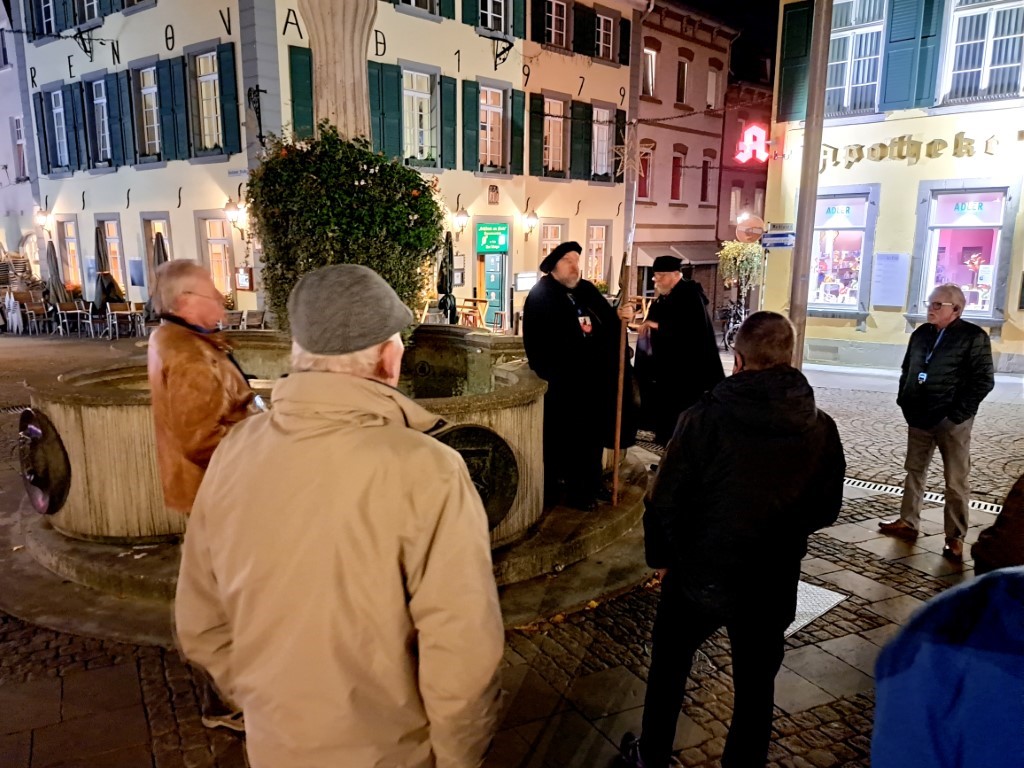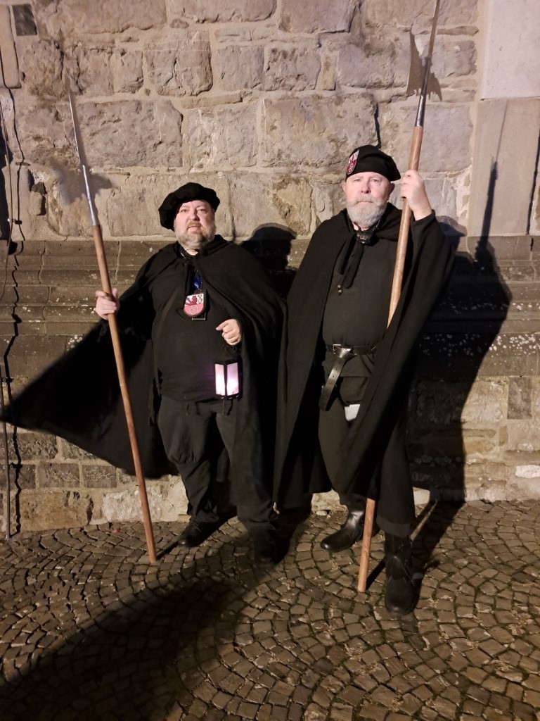 Bei stürmischem kaltem Wind nahmen sie uns mit auf einen rd. 2-stündigen Rundgang durch die Altstadt und erläuterten ausführlich, authentisch und anschaulich das Berufsbild des Nachtwächters. Man fühlte sich schon nach kurzer Zeit zurückversetzt ins Mittelalter, denn der Beruf des Nachtwächters kam mit dem Bestehen der ersten größeren Ansiedlungen auf. Nachtwächter gingen u.a. nachts durch die dunklen Wege und Straßen, sorgten für Ruhe und Ordnung, warnten die Bürger vor Feuer, Feinden und Dieben., überwachten das Verschließen von Türen und Stadttoren, sagten die Stunden an oder gaben Vermeldungen bekannt (Hört ihr Leute, lasst euch sagen.......)